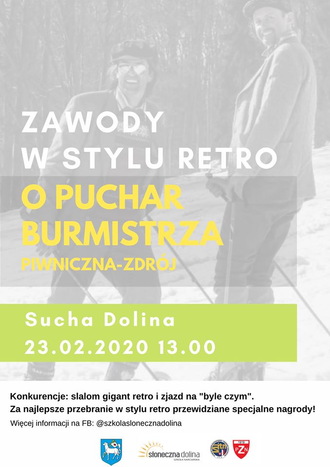 Szkoła Narciarska Słoneczna Dolina serdecznie zaprasza na II zawody w stylu retro o Puchar Burmistrza Piwniczna-Zdrój. Zawody odbędą się 23 lutego 2020 roku o godz. 13:00 Sucha Dolina. Konkurencje: slalom gigant retro i zjazd na „byle czym”. Ponadto za najlepsze przebranie w stylu retro przewidziane są specjalne nagrody! Więcej informacji na FB: @szkolaslonecznadolina