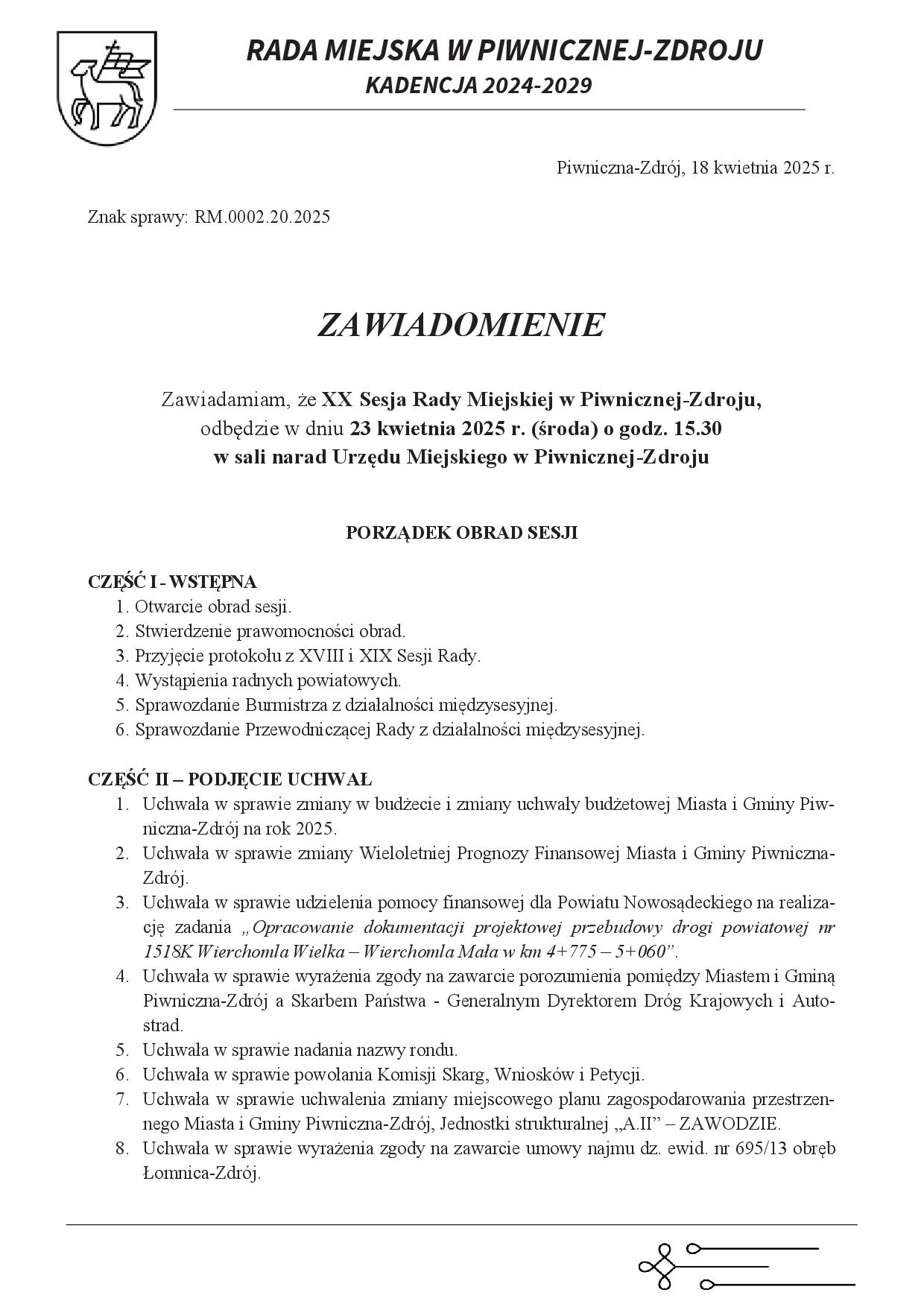 - PORZĄDEK OBRAD: XX Sesja Rady Miejskiej w Piwnicznej-Zdroju odbędzie się w dniu 23.04.2025 r. (środa) godz. 15:30