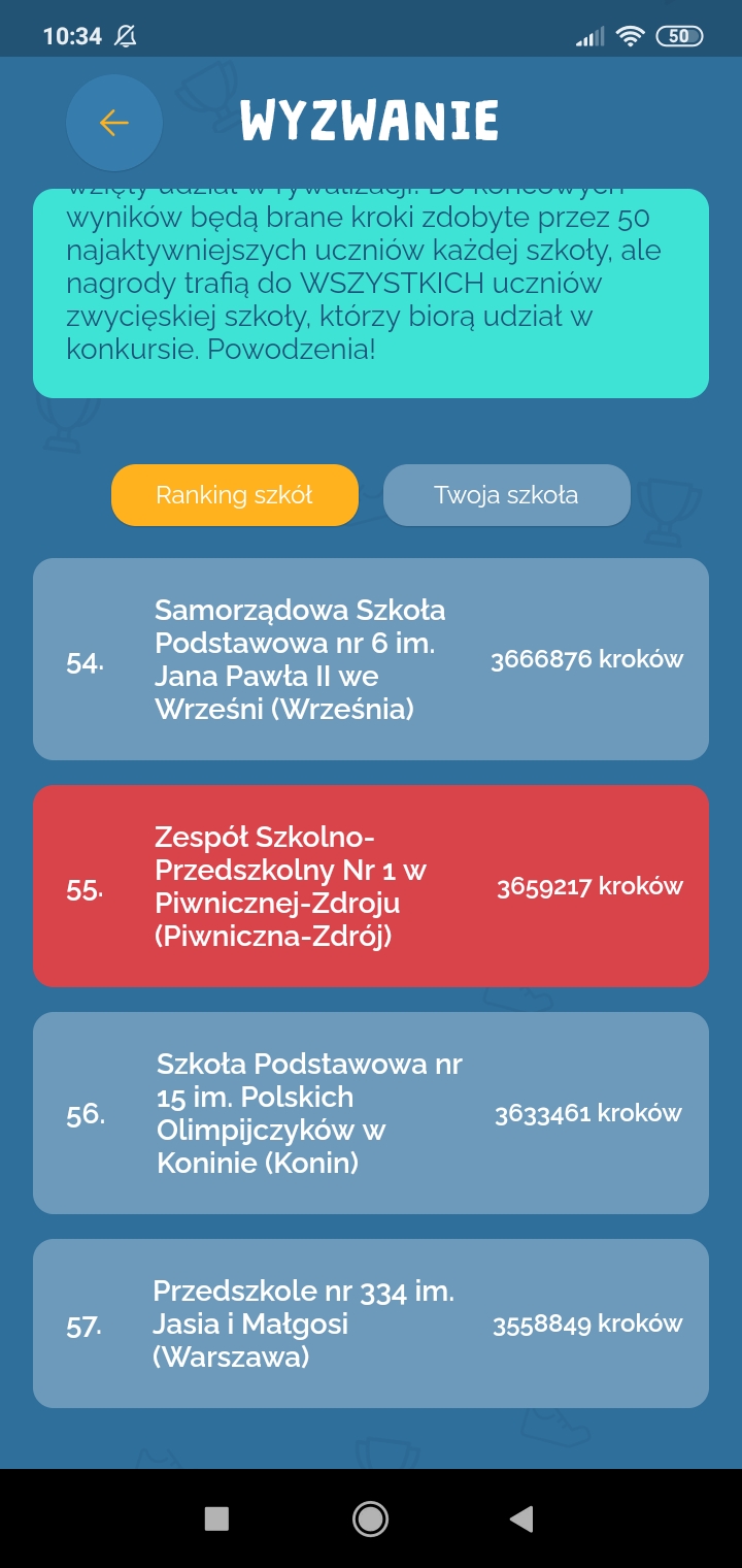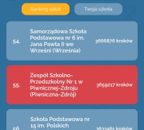 Z Zespołu Szkolno-Przedszkolnego Nr 1 w Piwnicznej-Zdroju do konkursu przystąpiło 50 uczniów. W końcowej rywalizacji na 500 szkół biorących udział zajęliśmy 55 miejsce. Razem uczniowie wychodzili 3 659 217 kroków.