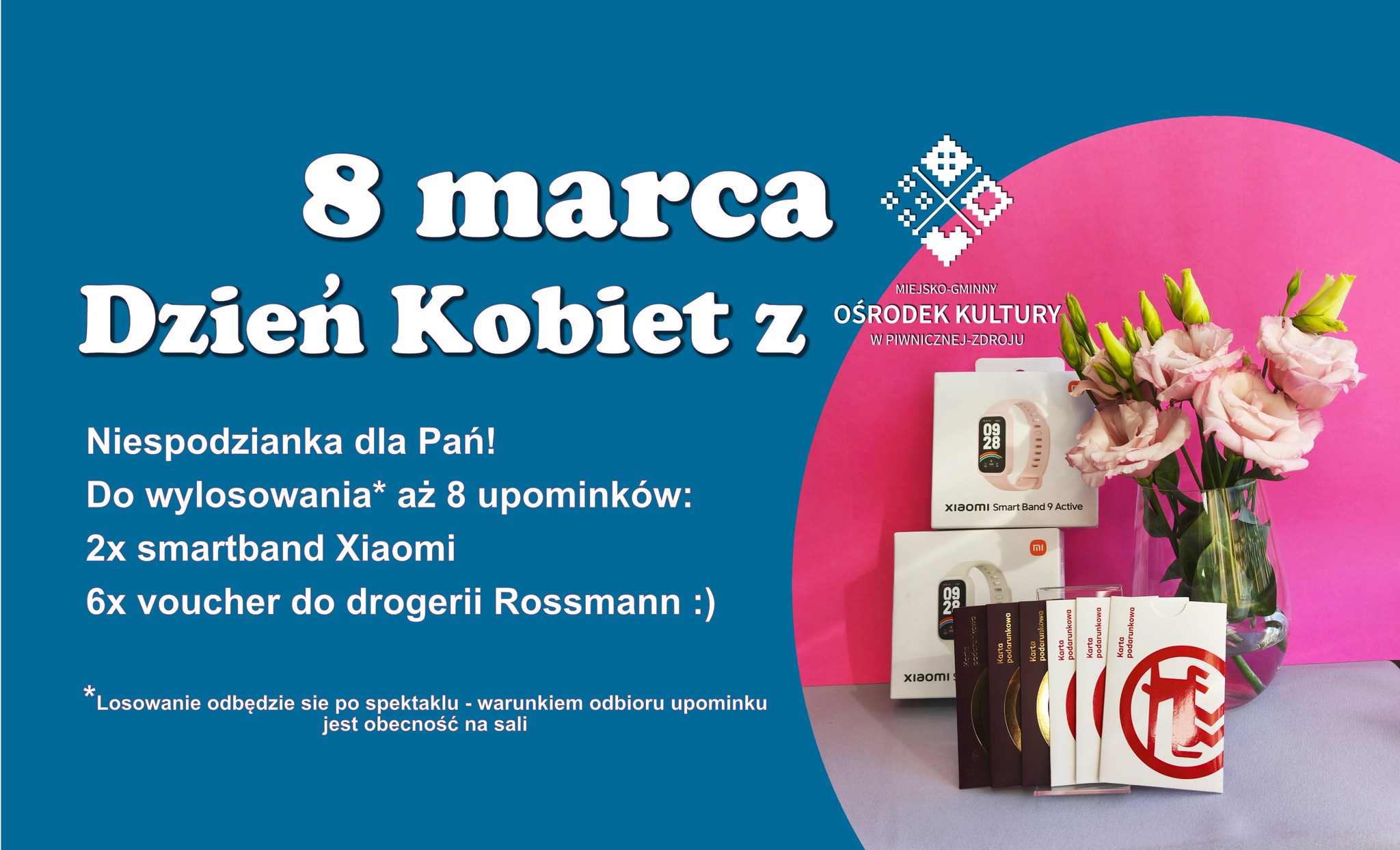Już 8 marca zapraszamy na Dzień Kobiet do Miejsko-Gminny Ośrodek Kultury w Piwnicznej-Zdroju. Czekaja na Was warsztaty z tworzenia perfum, koncert Marty Fiedor oraz Spektakl w wykonaniu Aktywnych Penelop. Tuż po nim rozlosujemy wśród Pań 8 upominków: 2x smartband Xiaomi oraz 6x Voucher do drogerii Rossmann. Po bezpłatne wejściówki zapraszamy do Informacji Turystycznej w Piwnicznej-Zdrój ul. Rynek 11.