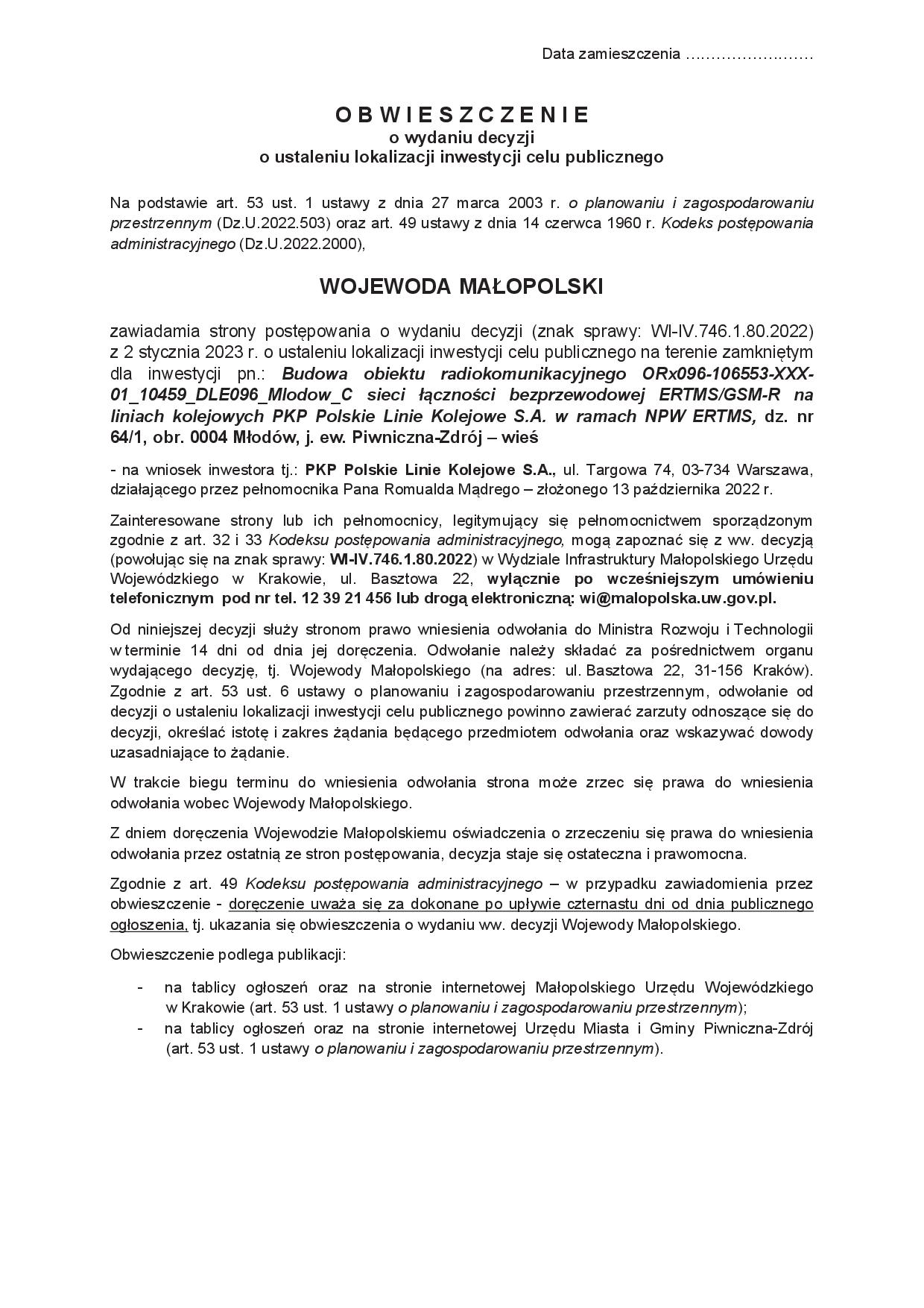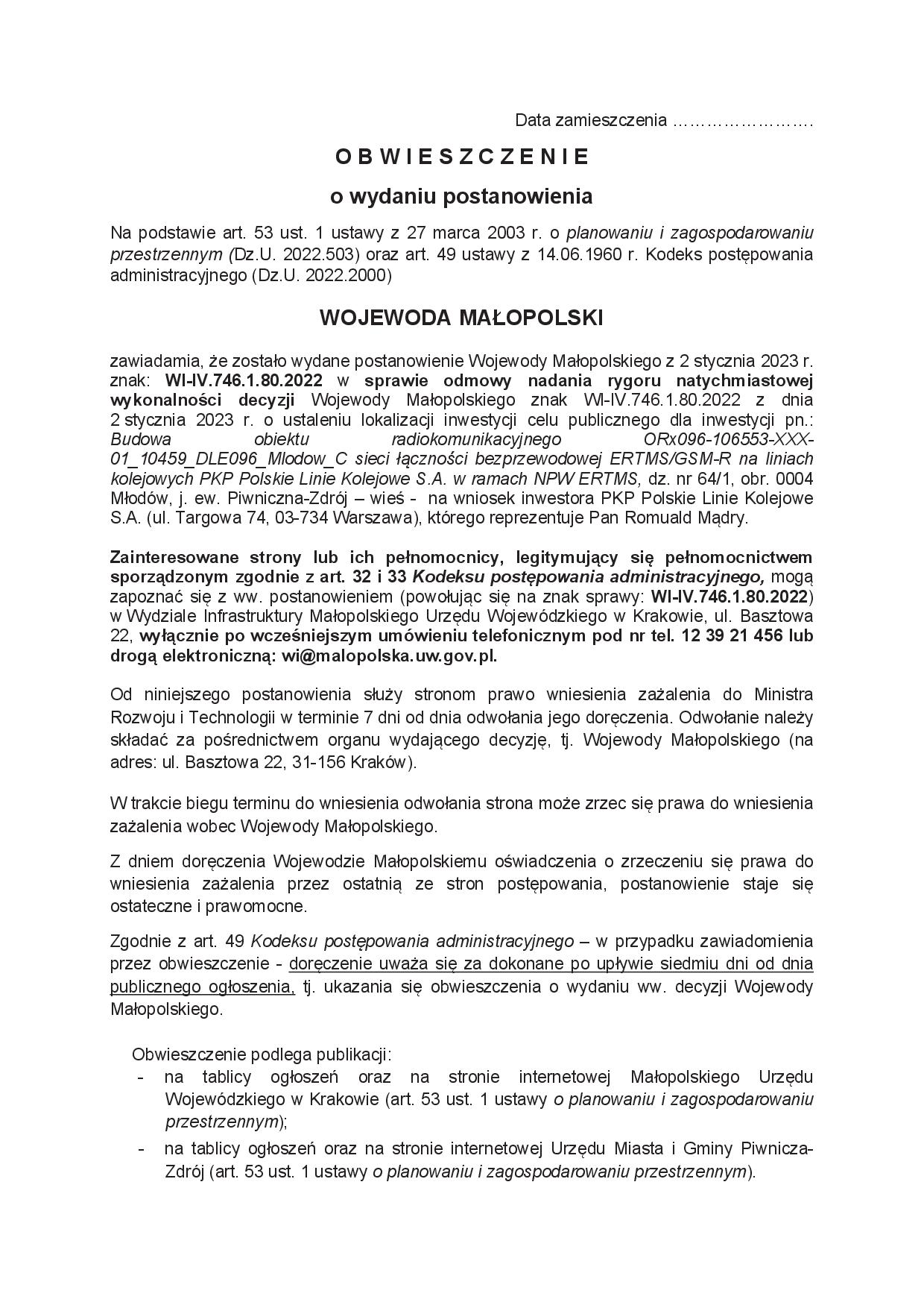 Zawiadamiam, że LV Sesja Rady Miejskiej w Piwnicznej-Zdroju, zwołana na podstawie art. 20 ust. 3 ustawy z dnia 8 marca 1990 r. o samorządzie gminnym (Dz. U. z 2023 r. poz. 40) na wniosek Burmistrza Piwnicznej-Zdroju odbędzie się w dniu 25 stycznia 2023 r. (środa) o godz. 14.00 w sali narad Urzędu Miejskiego w Piwnicznej-Zdroju. Wiceprzewodniczący Rady Miejskiej Lech Maślanka.