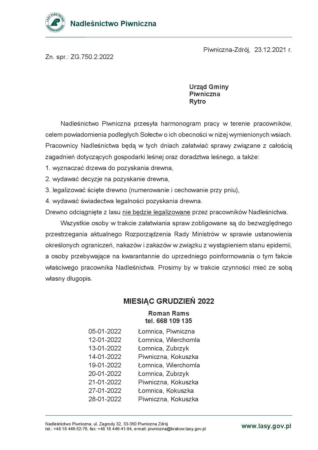Zakład Leśno-Drzewny Piwniczna-Zdrój, Kosarzyska 19 zawiadamia, że w postępowaniu prowadzonym w trybie zapytania ofertowego na: „Usługi z zakresu gospodarki leśnej: pozyskania, zrywki i manipulacji drewna, prac hodowlanych i ochrony lasu według planów gospodarczych na 2022 r.”