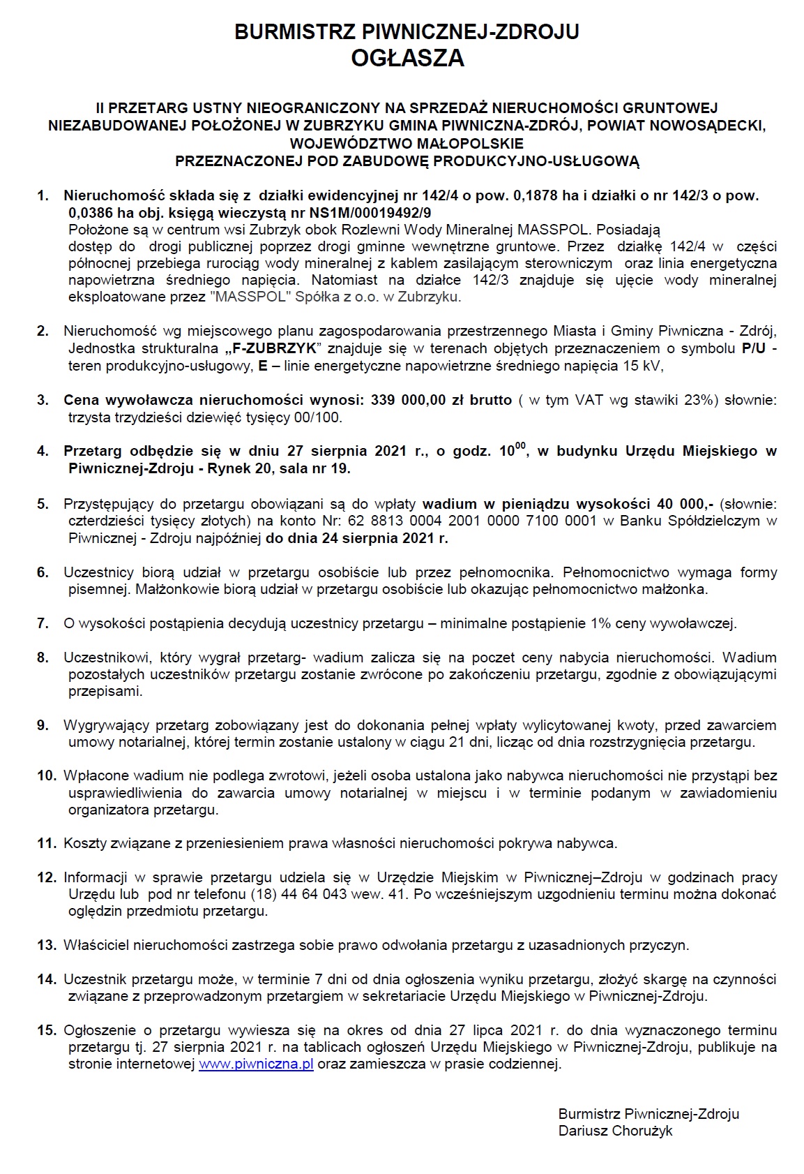 o wyłożeniu do publicznego wglądu projektu Uproszczonego Planu Urządzenia Lasu, dla lasów stanowiących własność Miasta i Gminy Piwniczna – Zdrój. Na podstawie art. 21 ust. 4 ustawy z dnia 28 września 1991 r. o lasach (tekst jedn. Dz.U. z 2020 r. poz. 6), zawiadamiam o wyłożeniu do publicznego wglądu projektu uproszczonego planu urządzenia lasu na okres od 01.01.2022 r. do 31.12.2031 r., w terminie od dnia 28 lipca 2021 r. do dnia 28 września 2021 r. Projekt planu udostępniony jest w formie elektronicznej w siedzibie Zakładu Leśno-Drzewnego, 33-350 Piwniczna-Zdrój, Kosarzyska 19, w godzinach pracy 7:00 – 15:00.