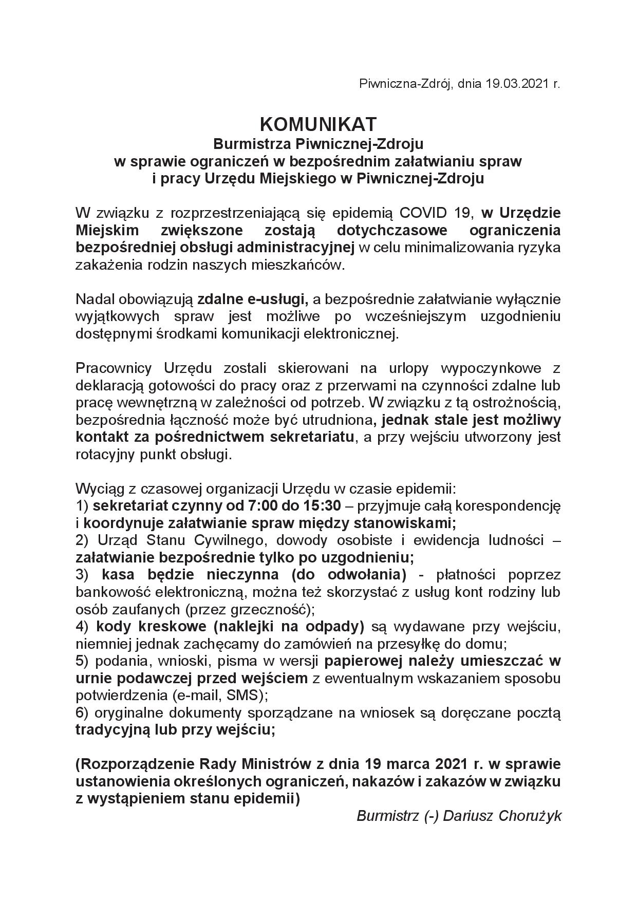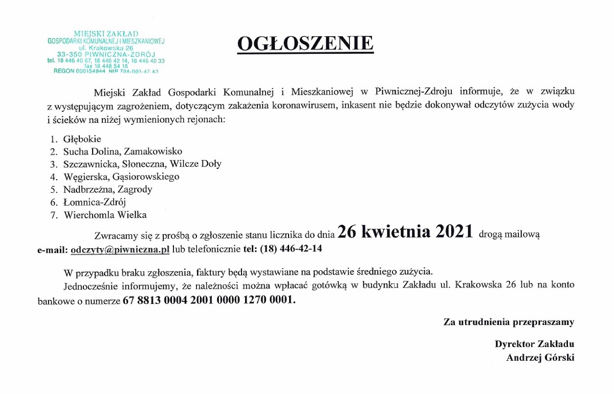 Zawiadamiamy, że wspólne posiedzenie Komisji Rady Miejskiej w Piwnicznej-Zdroju, odbędzie się w dniu 29 kwietnia 2021 r. (czwartek) o godz. 9:00 w sali narad Urzędu Miejskiego w Piwnicznej-Zdroju. Przewodniczący poszczególnych Komisji Rady Miejskiej w Piwnicznej-Zdroju.