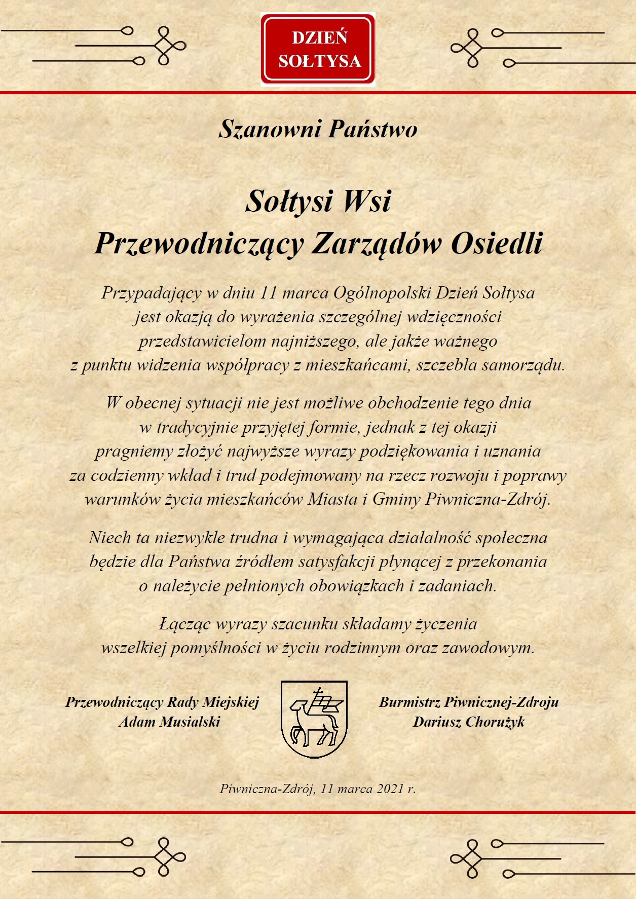 Podziękowania i życzenia dla Sołtysów Wsi i Przewodniczących Zarządów Osiedli za codzienny trud pracy na rzecz lokalnej społeczności składają Przewodniczący Rady Miejskiej Adam Musialski oraz Burmistrz Piwnicznej-Zdroju Dariusz Chorużyk.