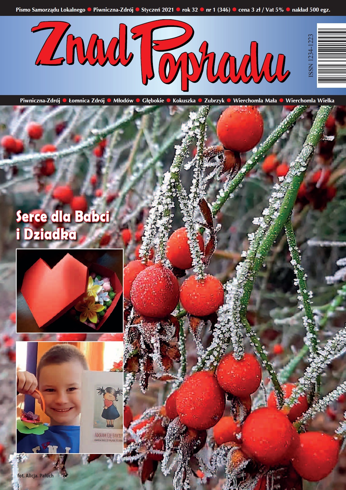 Zapraszamy do lektury Pisma Samorządu Lokalnego pt. "Znad Popradu" Styczeń 2021 rok, rok 32, nr 1(346). Informacje, aktualności, ciekawostki: Piwniczna-Zdrój, Łomnica Zdrój, Młodów, Głębokie, Kokuszka, Zubrzyk, Wierchomla Mała, Wierchomla Wielka. Redaktor naczelna: Barbara Paluchowa.