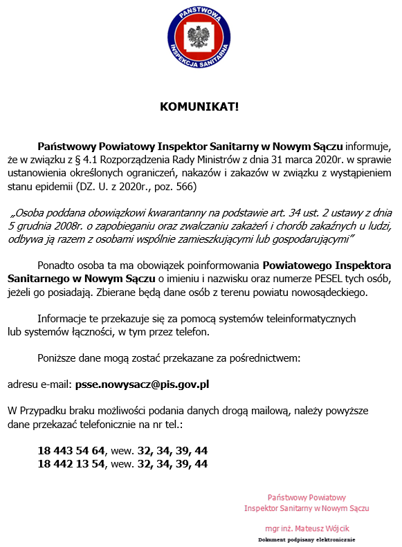 APEL Burmistrza Piwnicznej-Zdroju Dariusza Chorużyka do wszystkich Mieszkańców Miasta i Gminy "CHROŃ ŻYCIE ZOSTAŃ W DOMU" w związku z wprowadzeniem stanu epidemii w Polsce od dnia 20 marca 2020 r. do odwołania! COVID-19 – choroby wywołanej koronawirusem SARS-CoV-2 Obejrzyj APEL w [PEŁNYM EKRANIE]