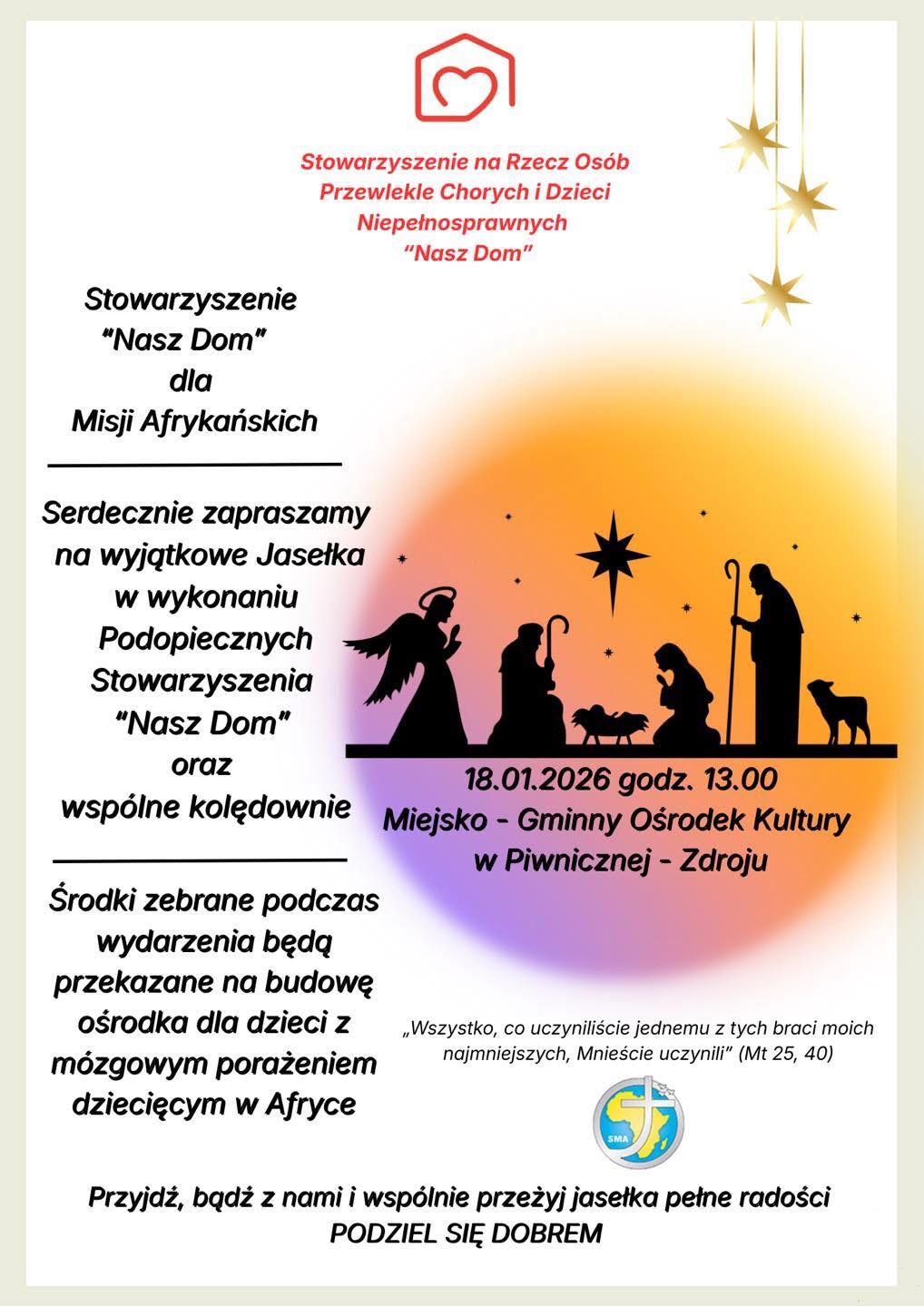 Projekt ma na celu artystyczne i edukacyjne odtworzenie zanikającej tradycji kolędowania Czarnych Górali – grupy etnograficznej Górali Nadpopradzkich z Piwnicznej-Zdroju. Inicjatywa łączy działania badawcze, teatralne, edukacyjne i promocyjne, służąc ochronie niematerialnego dziedzictwa kulturowego. Na podstawie źródeł etnograficznych i relacji mieszkańców powstanie scenariusz widowiska przedstawiające grupy kolędnicze oraz 3 scenariusze dla dzieci grup kolędniczych: