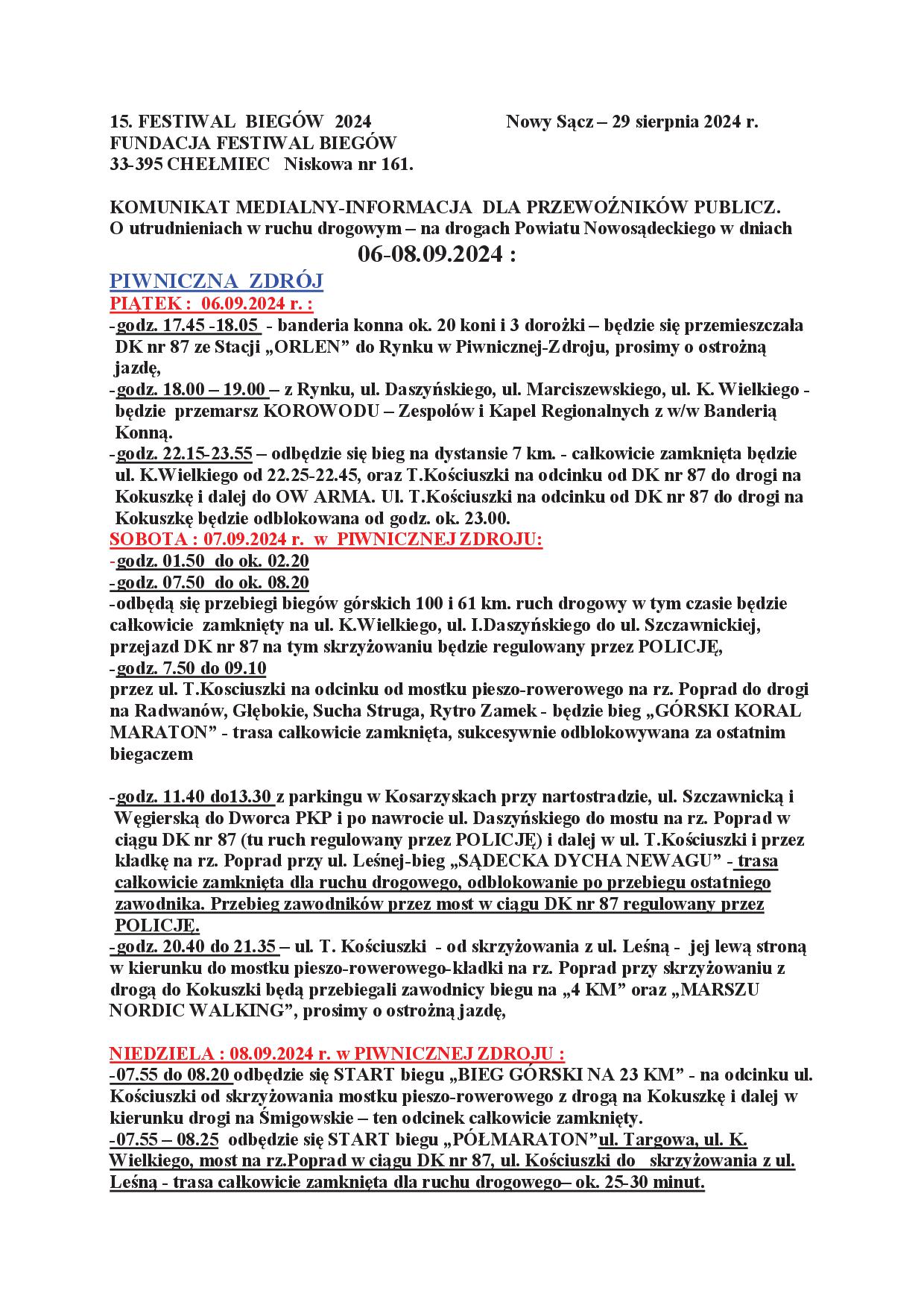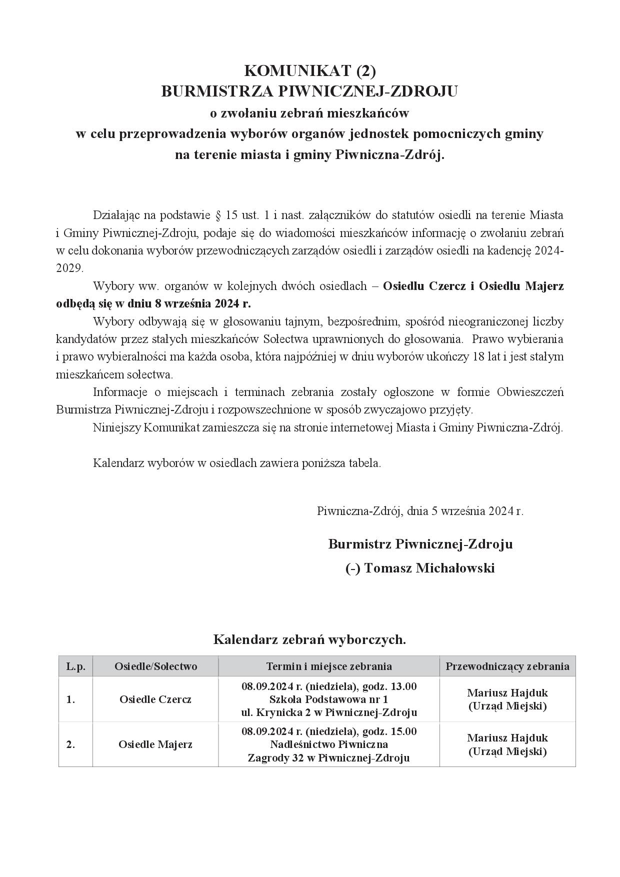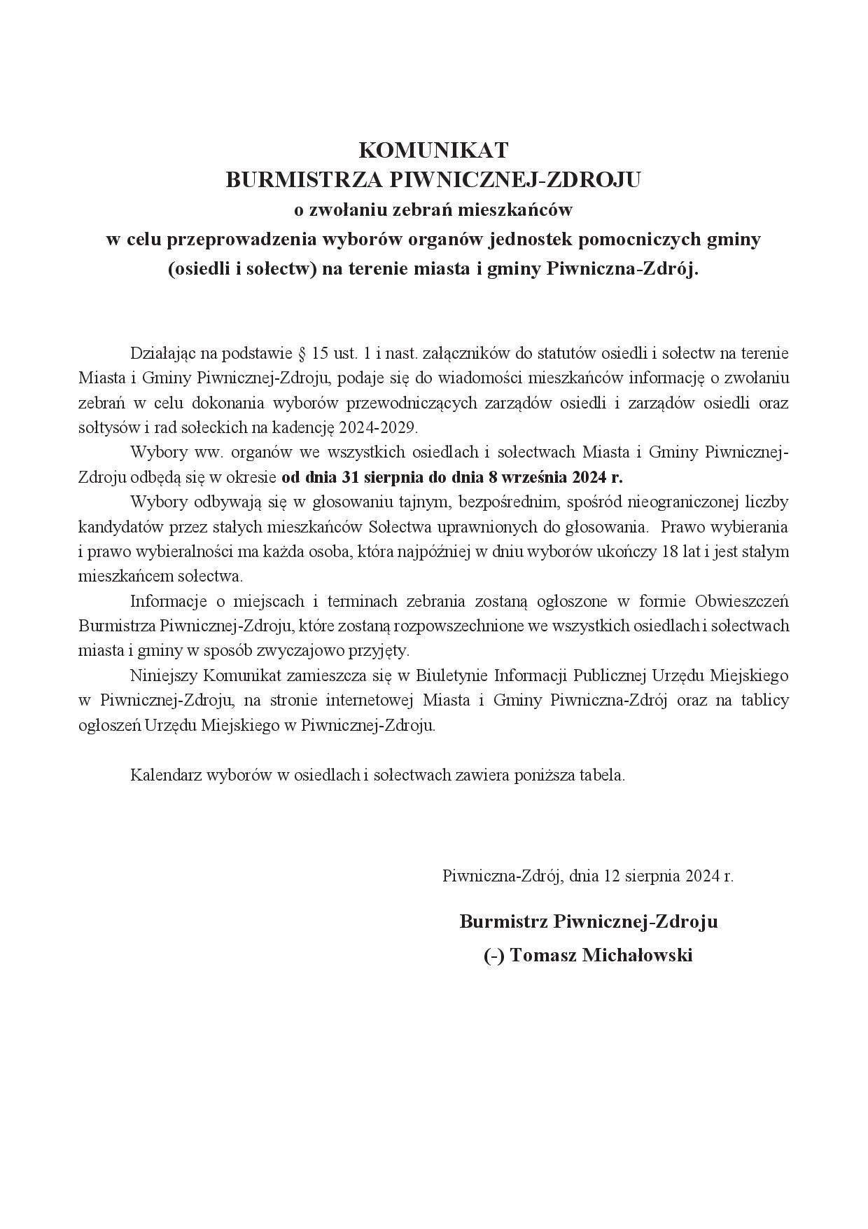 Szanowni Mieszkańcy Miasta i Gminy Piwniczna-Zdrój. Zgodnie z obowiązującymi w naszej gminie statutami 14 osiedli i sołectw, wybory przewodniczących i zarządów osiedli oraz sołtysów i rad sołeckich na nową kadencję (tj. na lata 2024-2029) przeprowadza się nie później niż 6 miesięcy po wyborach do Rady Miejskiej. Działając na tej podstawie, zarządziłem wybory ww. organów we wszystkich osiedlach i sołectwach naszej gminy w dniach od 31 sierpnia do 8 września 2024 r., a szczegółowy kalendarz tych wyborów znajdziecie Państwo na stronach internetowych Urzędu Miasta oraz w urzędowych obwieszczeniach, które zostały umieszczone na tablicach ogłoszeń i w innych miejscach zwyczajowo przyjętych.