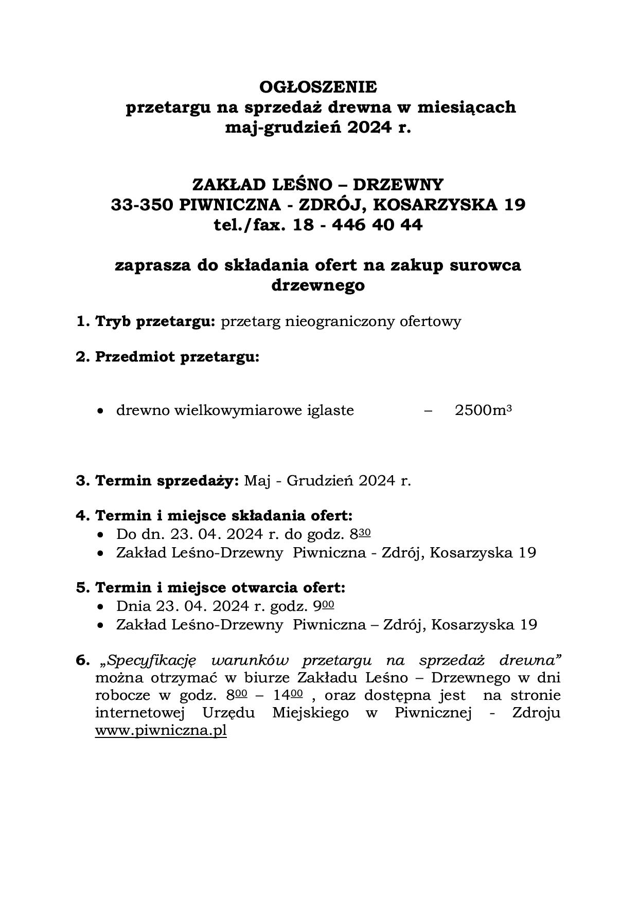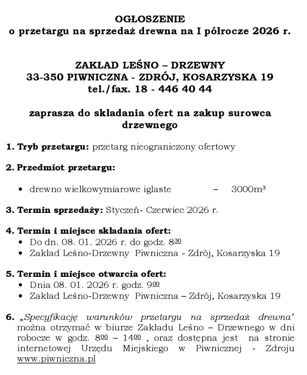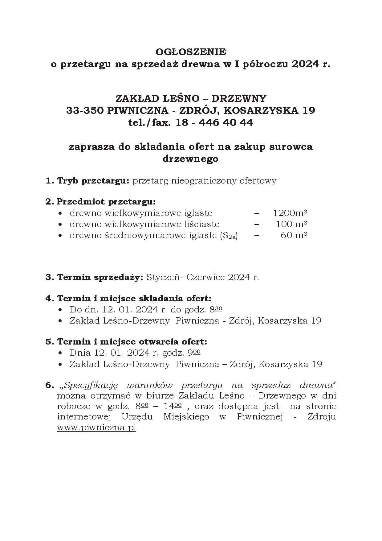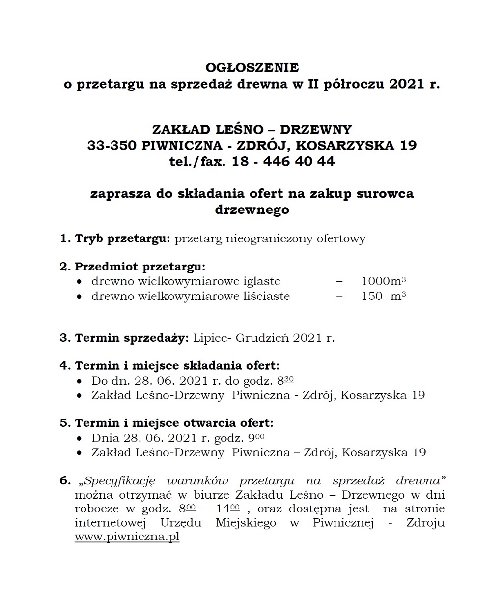 6.„Specyfikację warunków przetargu na sprzedaż drewna” można otrzymać w biurze Zakładu Leśno – Drzewnego w dni robocze w godz. 800 – 1400 oraz dostępna jest na stronie internetowej Urzędu Miejskiego w Piwnicznej - Zdroju www.piwniczna.pl
