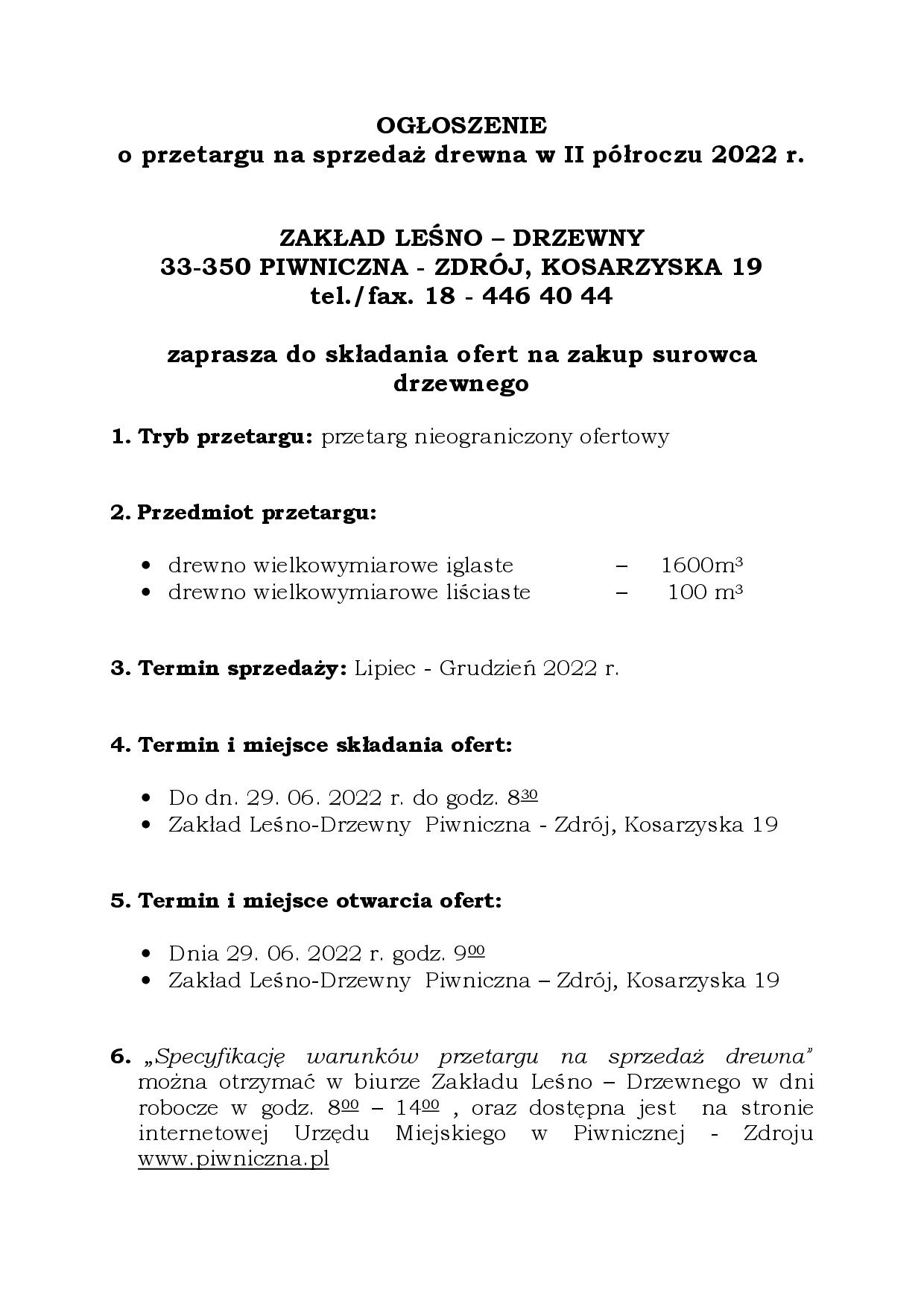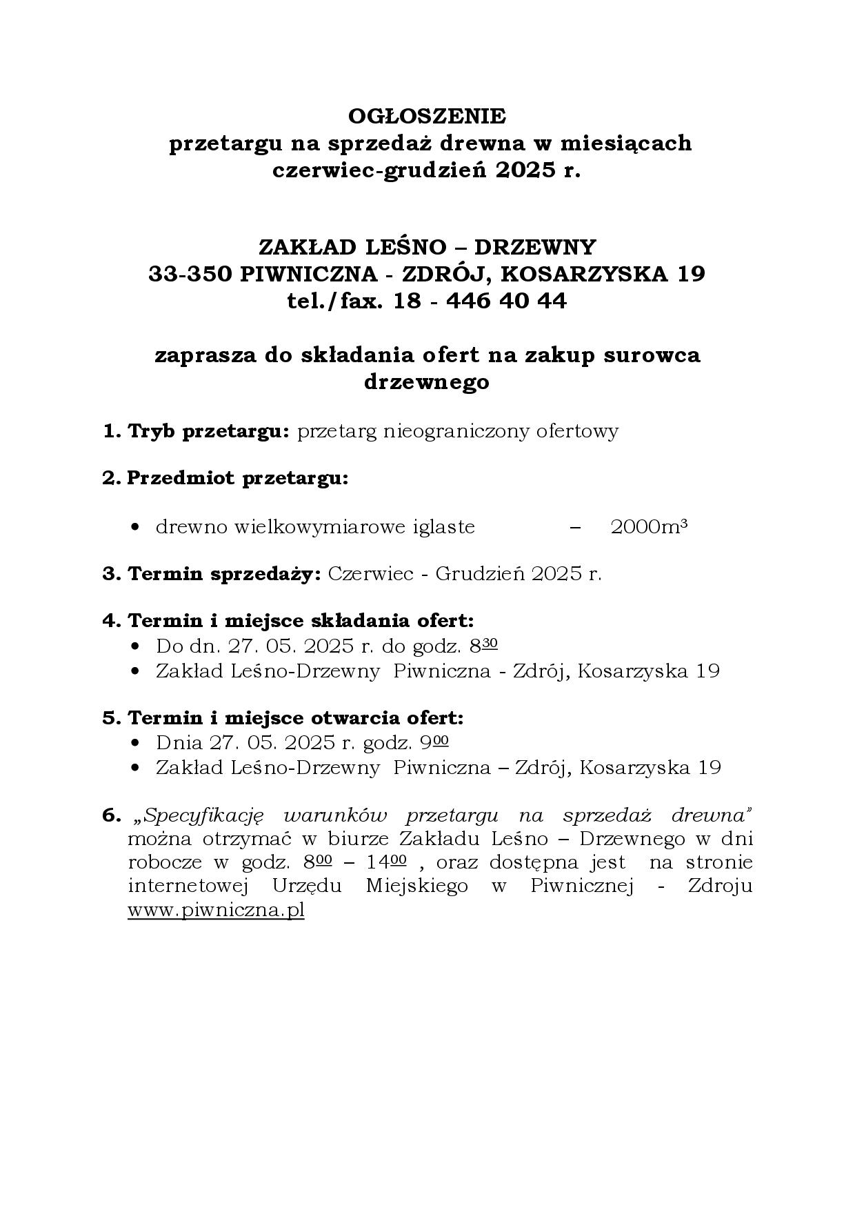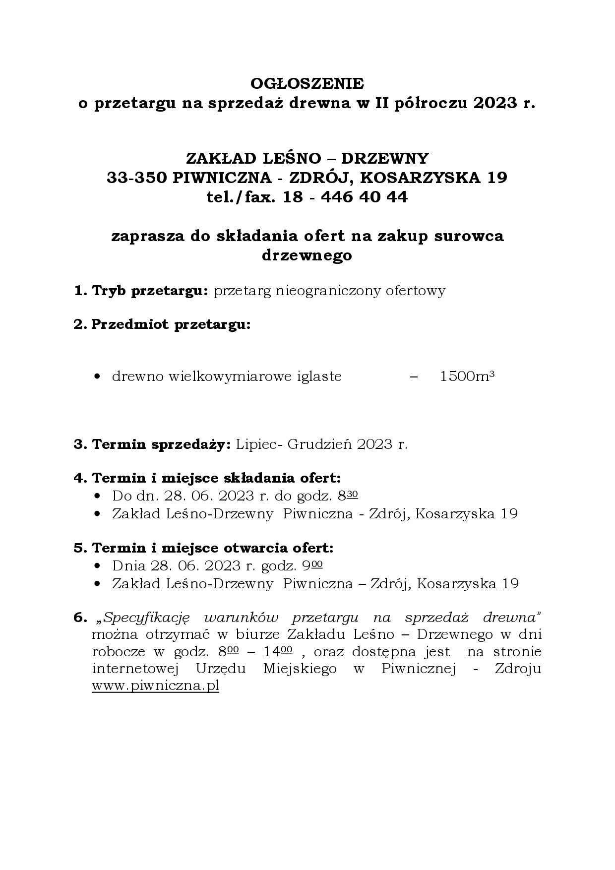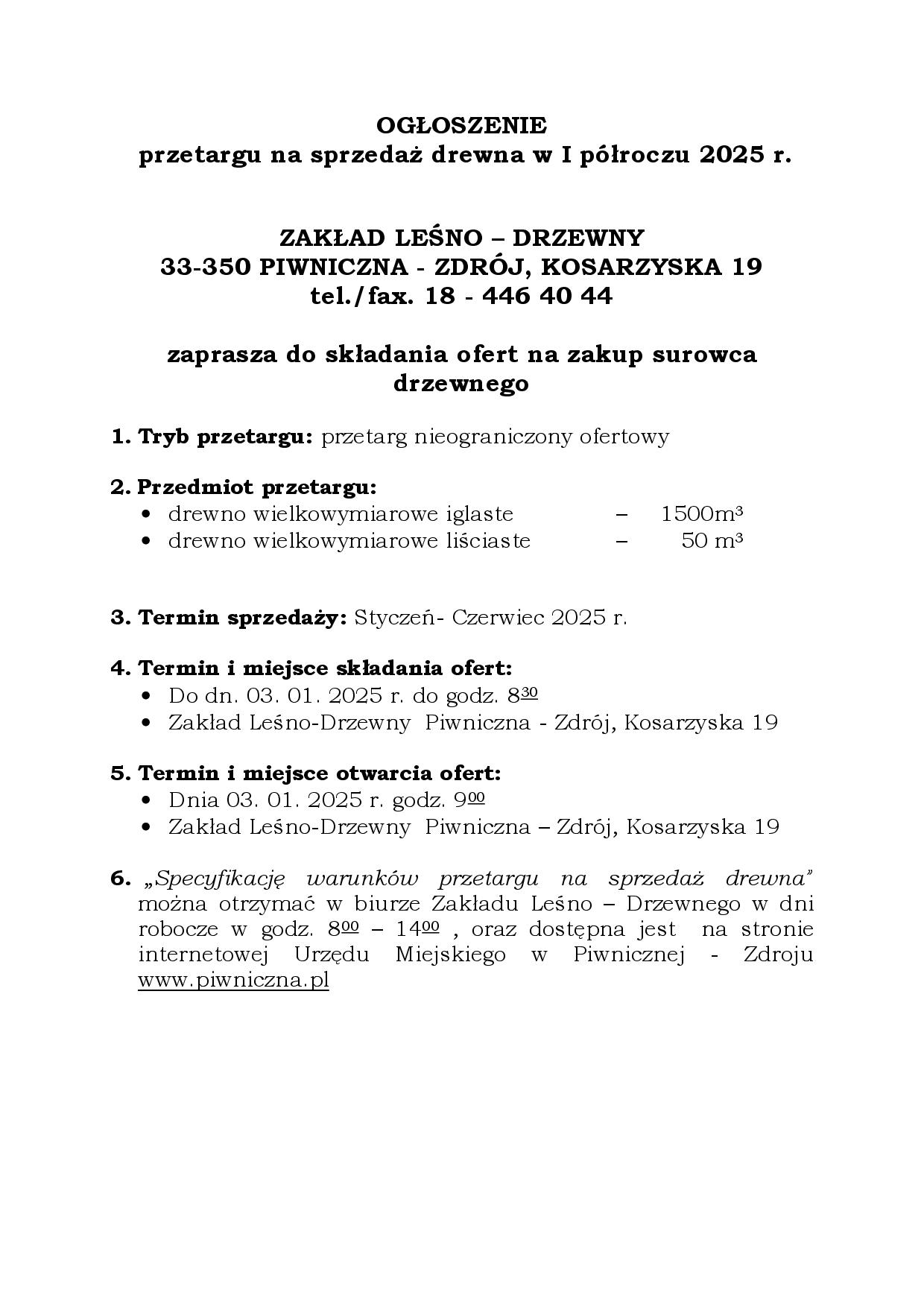 6.„Specyfikację warunków przetargu na sprzedaż drewna” można otrzymać w biurze Zakładu Leśno – Drzewnego w dni robocze w godz. 800 – 1400 oraz dostępna jest na stronie internetowej Urzędu Miejskiego w Piwnicznej - Zdroju www.piwniczna.pl