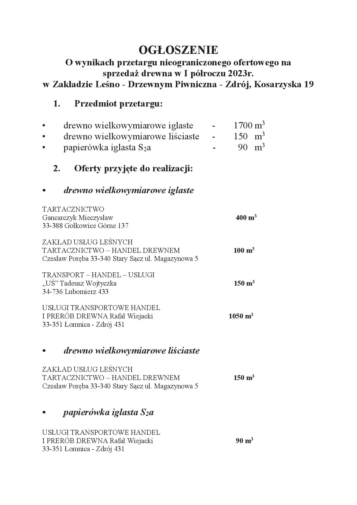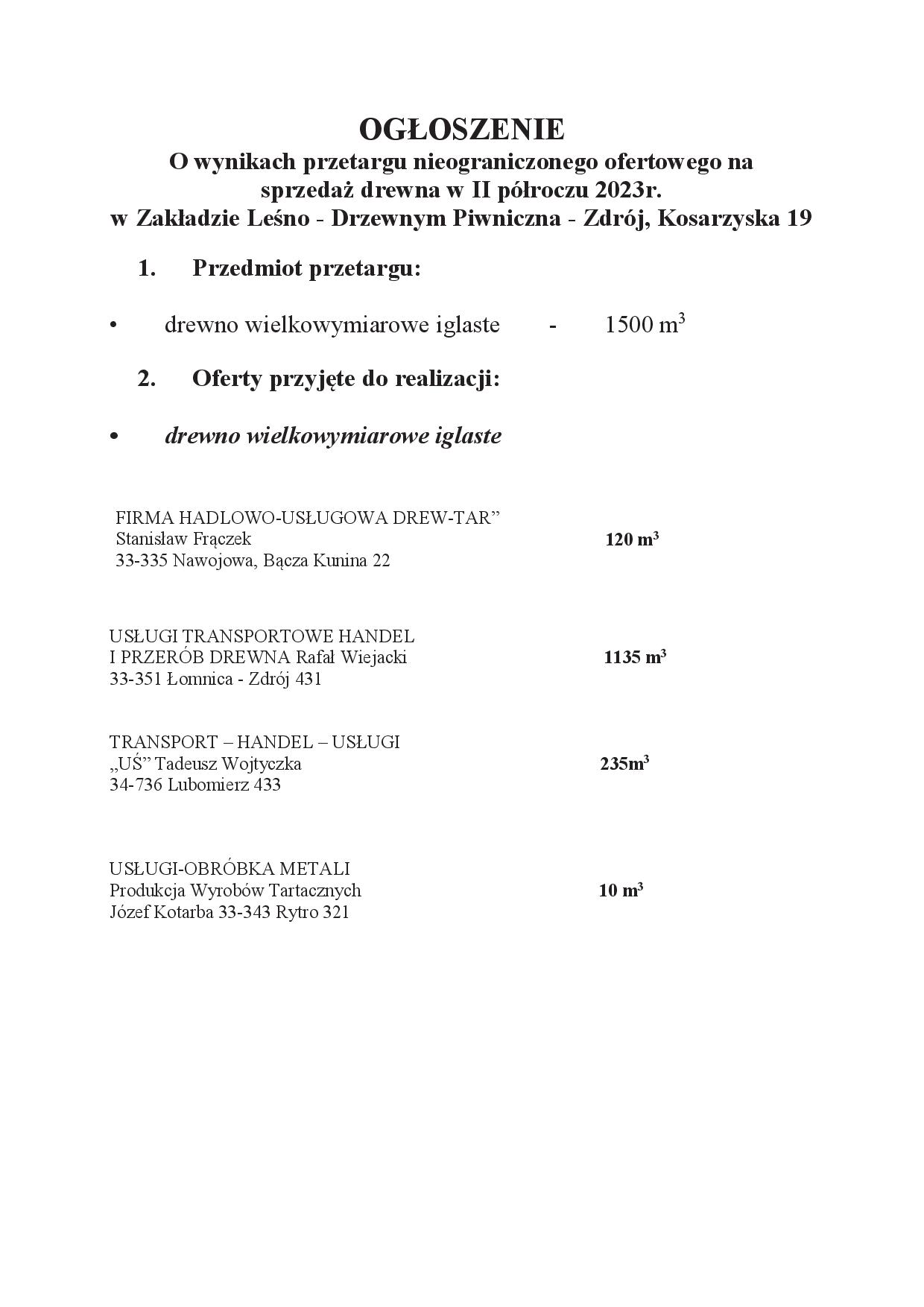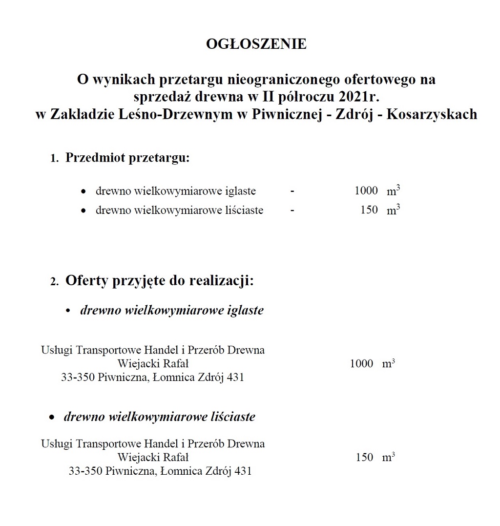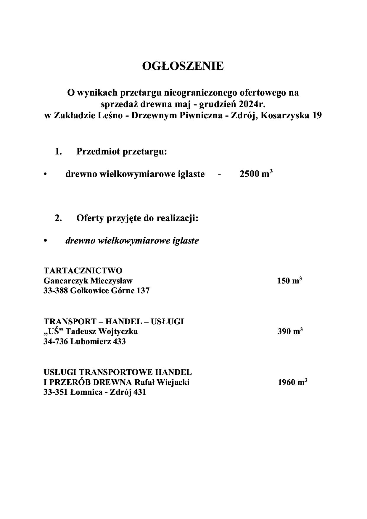 [2025-01-03] ZL-D: Ogłoszenie o wynikach przetargu na sprzedaż drewna I półrocze 2025 r.