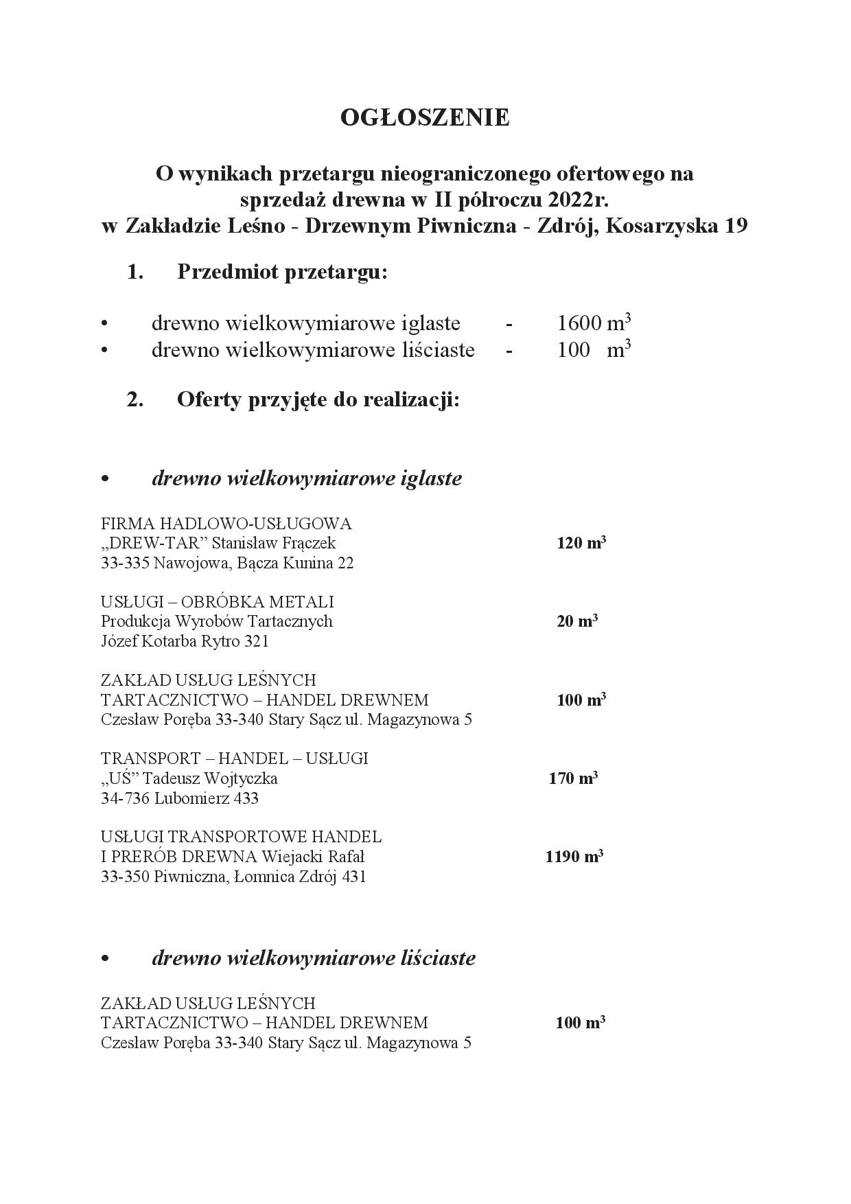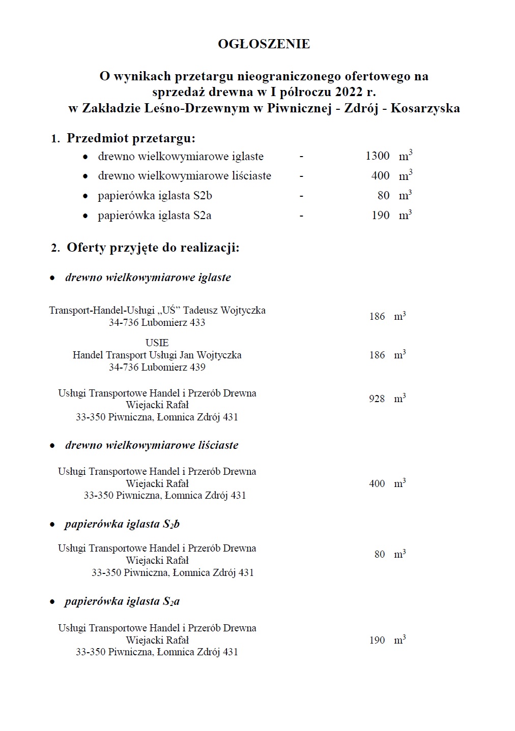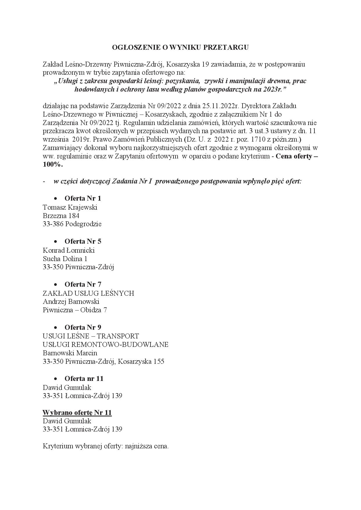Zakład Leśno-Drzewny Piwniczna-Zdrój, Kosarzyska 19 zawiadamia, że w postępowaniu prowadzonym w trybie zapytania ofertowego na: