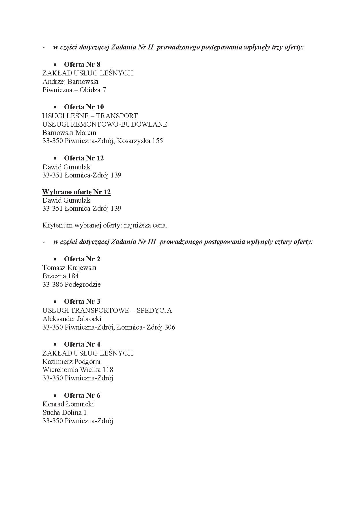 Oferty złożone na Zadanie Nr II przekroczyły kwoty jakie Zamawiający zamierzał przeznaczyć na sfinansowanie zamówienia. Zgodnie z Rozdziałem 7 § 9 pkt 2 - 5 Regulaminu przeprowadzono z oferentem: ZAKŁAD USŁUG LEŚNYCH Andrzej Barnowski Piwniczna- Obidza 7 negocjacje cenowe. Negocjacje przyniosły rozstrzygnięcie. W wyniku negocjacji dokonano wyboru: