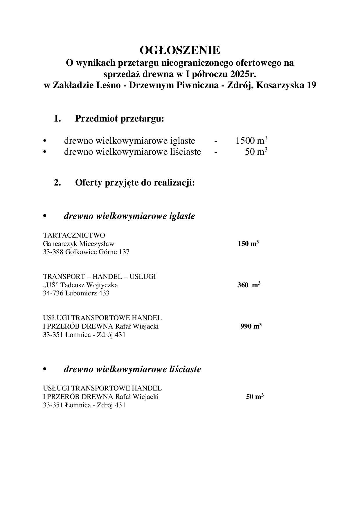 [2025-05-27] ZL-D: Ogłoszenie o wynikach przetargu na sprzedaż drewna czerwiec-grudzień 2025 r.
