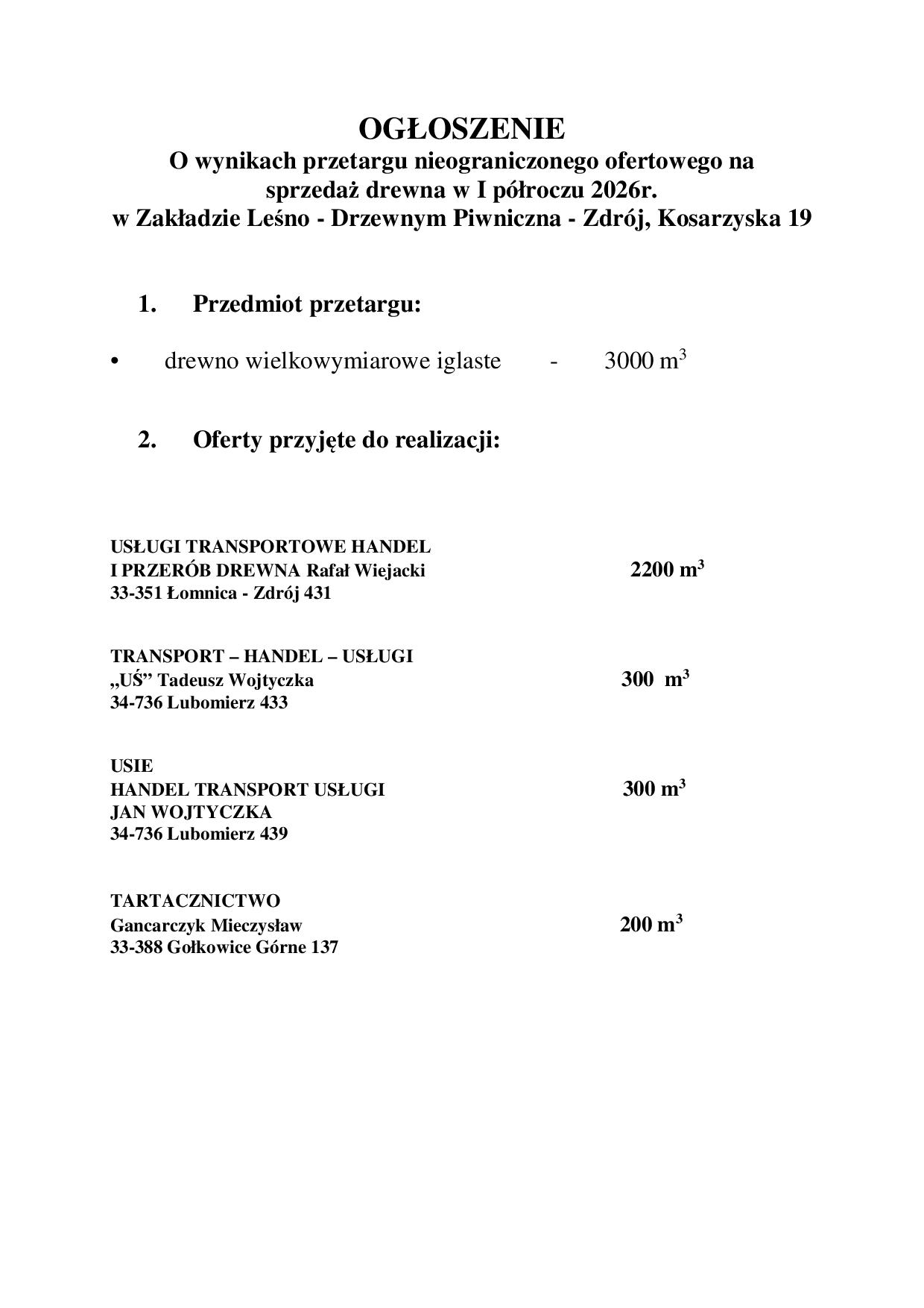 [2026-01-08] ZLD: Ogłoszenie o wynikach przetargu na sprzedaż drewna I półrocze 2026 r.