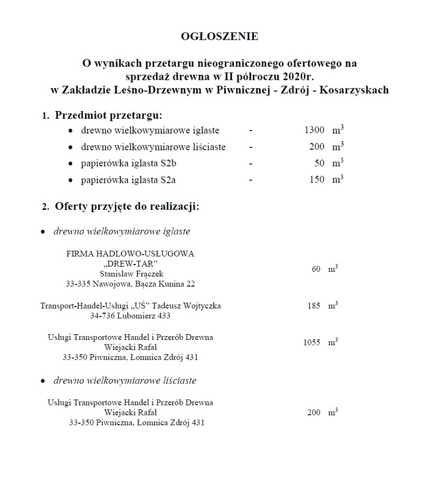 [2020-03-06] ZL-D: Ogłoszenie o wynikach przetargu na sprzedaż drewna I półrocze 2020 r.