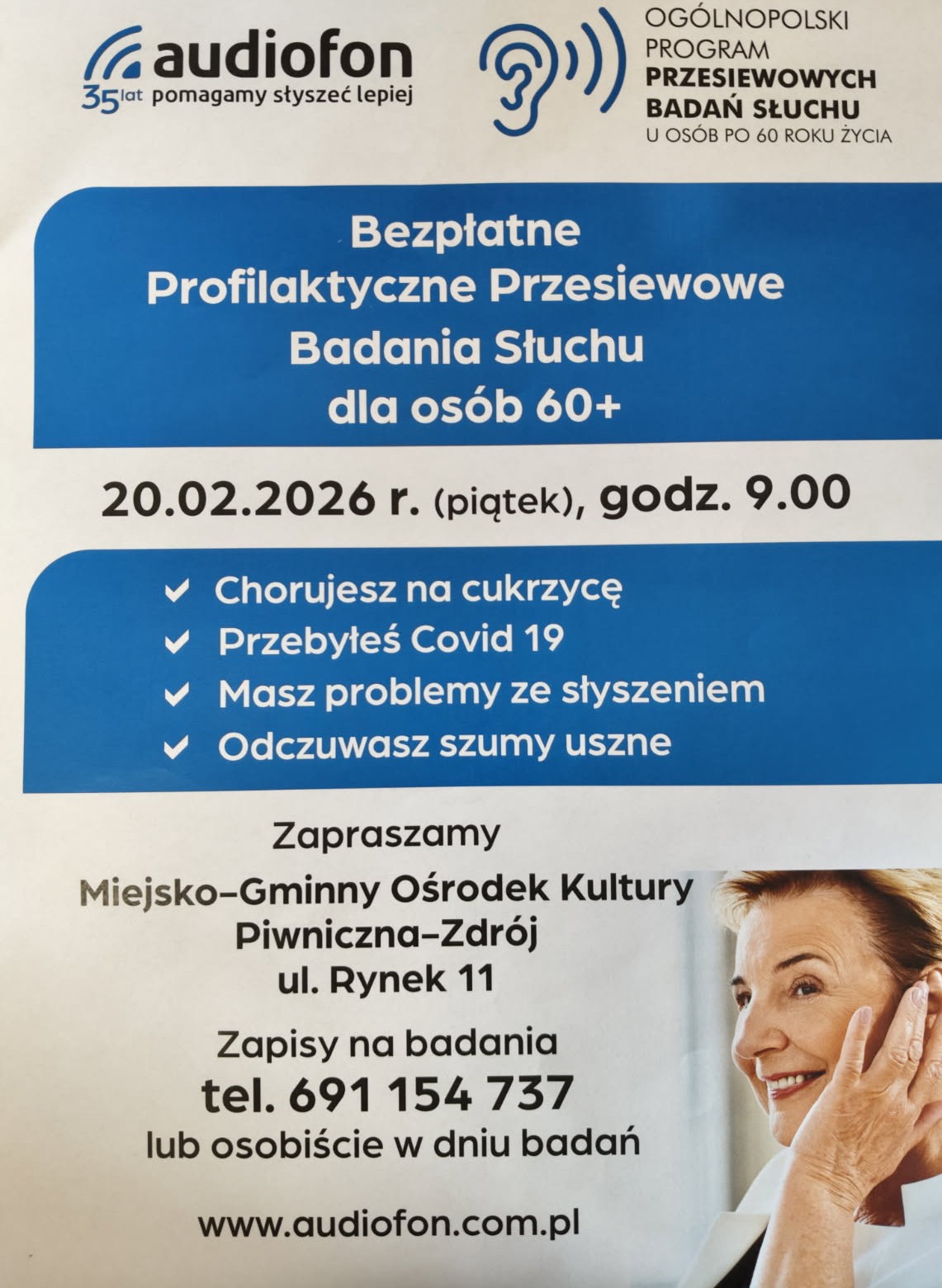 [06.02.2026]: STREFA SENIORA: Bezpłatne Profilaktyczne Przesiewowe Badania Słuchu dla osób 60+ w dniu 20.02.2026 r. (piątek), godz. 9:00 w MGOK. UWAGA! Obowiązują zapisy!