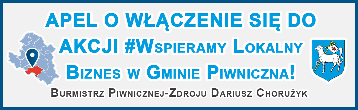 Przyłącz się do akcji, #Wspieramy Lokalny Biznes w Gminie Piwniczna! Drogi Mieszkańcu zostań w domu, zamawiaj towary, gotowe posiłki, prasę - telefonicznie z domu i do domu lub do biura. Kupuj towary oraz korzystaj z usług piwniczańskich przedsiębiorców.