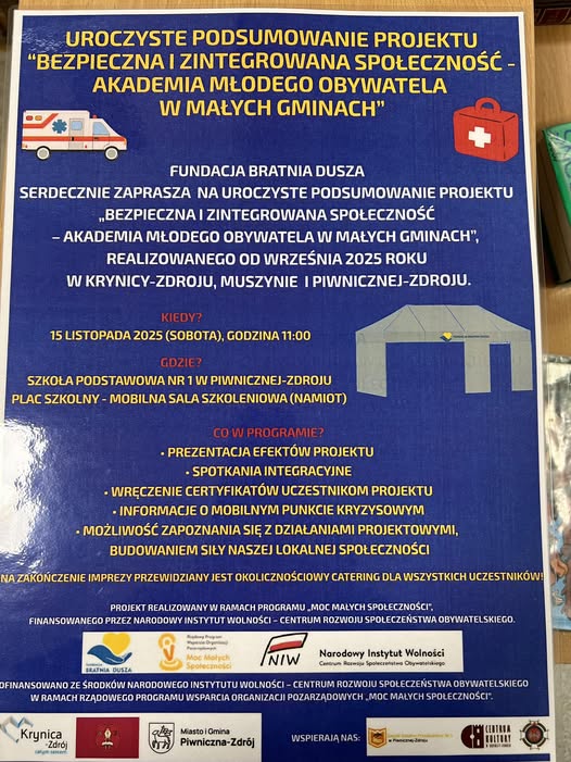 Projekt został zrealizowany przez Fundacje Bratnia Dusza w ramach Rządowego Programu Wsparcia Organizacji Pozarządowych „Moc Małych Społeczności”, finansowanego przez Narodowy Instytut Wolności – Centrum Rozwoju Społeczeństwa Obywatelskiego. Razem tworzymy bezpieczną przyszłość naszej gminy!