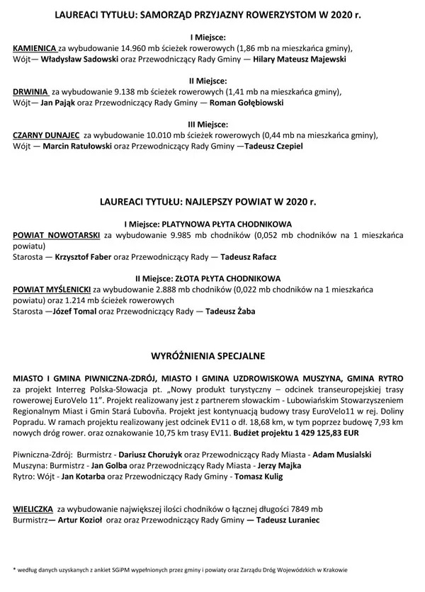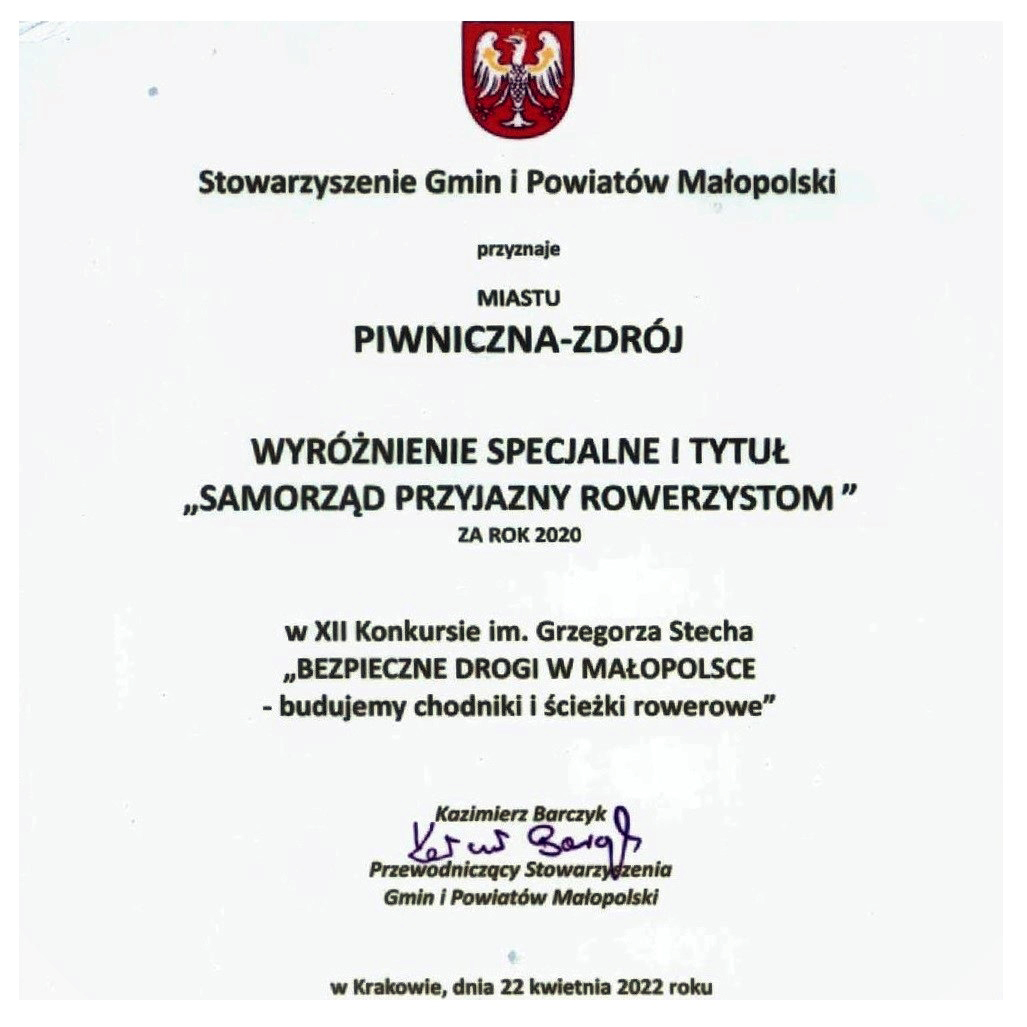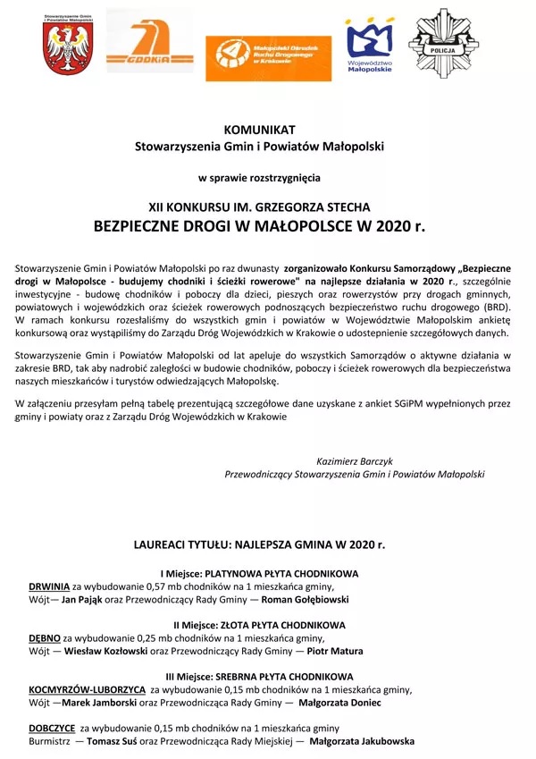 Stowarzyszenie Gmin i Powiatów Małopolski po raz dwunasty zorganizowało Konkursu Samorządowy "Bezpieczne drogi w Małopolsce - budujemy chodniki i ścieżki rowerowe" na najlepsze działania w 2020 r., szczególnie inwestycyjne - budowę chodników i poboczy dla dzieci, pieszych oraz rowerzystów przy drogach gminnych, powiatowych i wojewódzkich oraz ścieżek rowerowych podnoszących bezpieczeństwo ruchu drogowego (BRD). Wręczenie Tytułów nastąpiło 22 kwietnia br. o godz. 10.30 w Sali Konferencyjnej SGiPM, przy ul. Grodzka 15/2 w Krakowie.