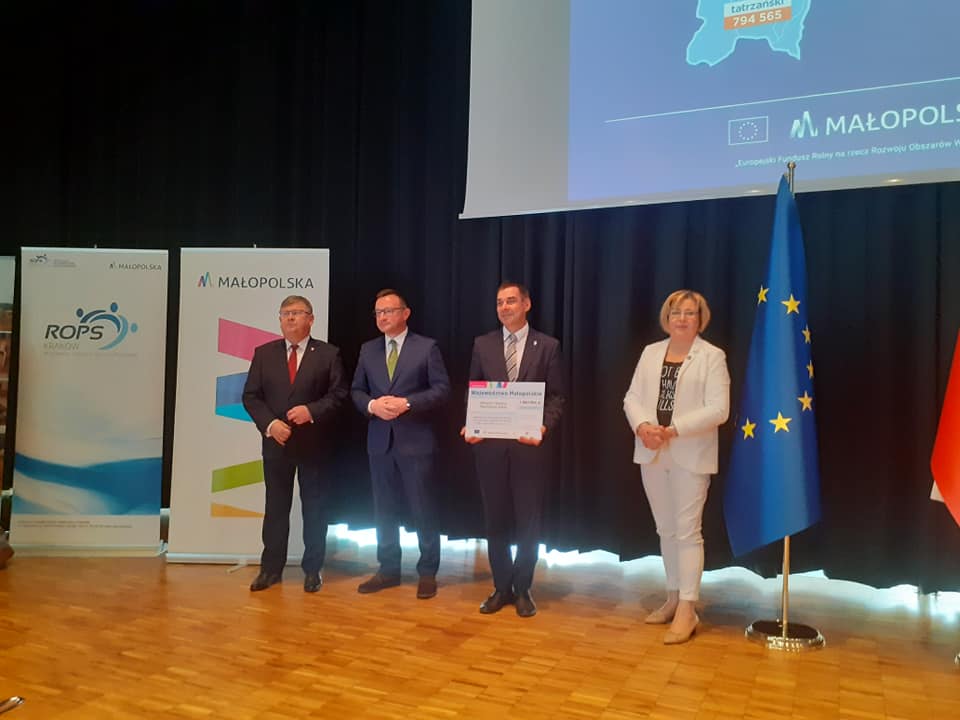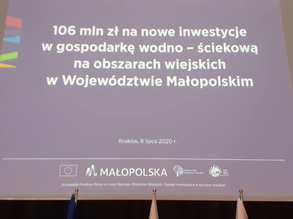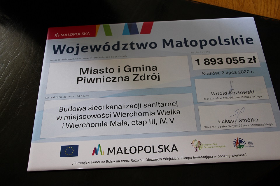 W dniu 08.07.2020 roku w Muzeum Lotnictwa Polskiego w Krakowie odbyło przekazanie czeku na realizację projektu pt. „Budowa sieci kanalizacji sanitarnej w miejscowości Wierchomla Wielka i Wierchomla Mała, etap II, IV, V” w ramach poddziałania „Wsparcie inwestycji związanych z tworzeniem, ulepszaniem lub rozbudową wszystkich rodzajów małej infrastruktury, w tym inwestycji w energię odnawialną i w oszczędzanie energii objętego Programem Rozwoju Obszarów Wiejskich na lata 2014-2020 r. w ramach operacji typu „Gospodarka wodno-ściekowa”.