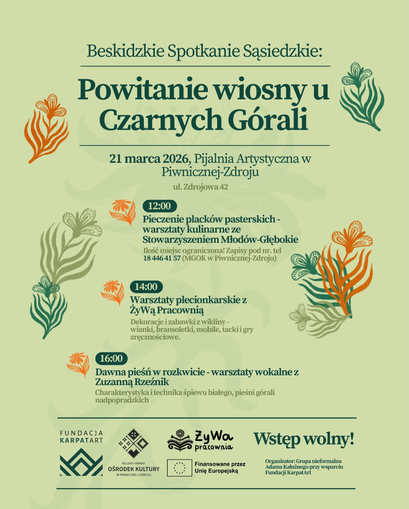 Wydarzenie organizuje grupa nieformalna Adama Kałużnego we współpracy z Fundacją KarpatArt, w ramach projektu „Beskidzkie Spotkania Sąsiedzkie” finansowanego przez Europejski Korpus Solidarności. Naszym celem jest pokazanie, że tradycja może być żywa, współczesna i łącząca ludzi z różnych kultur i środowisk.