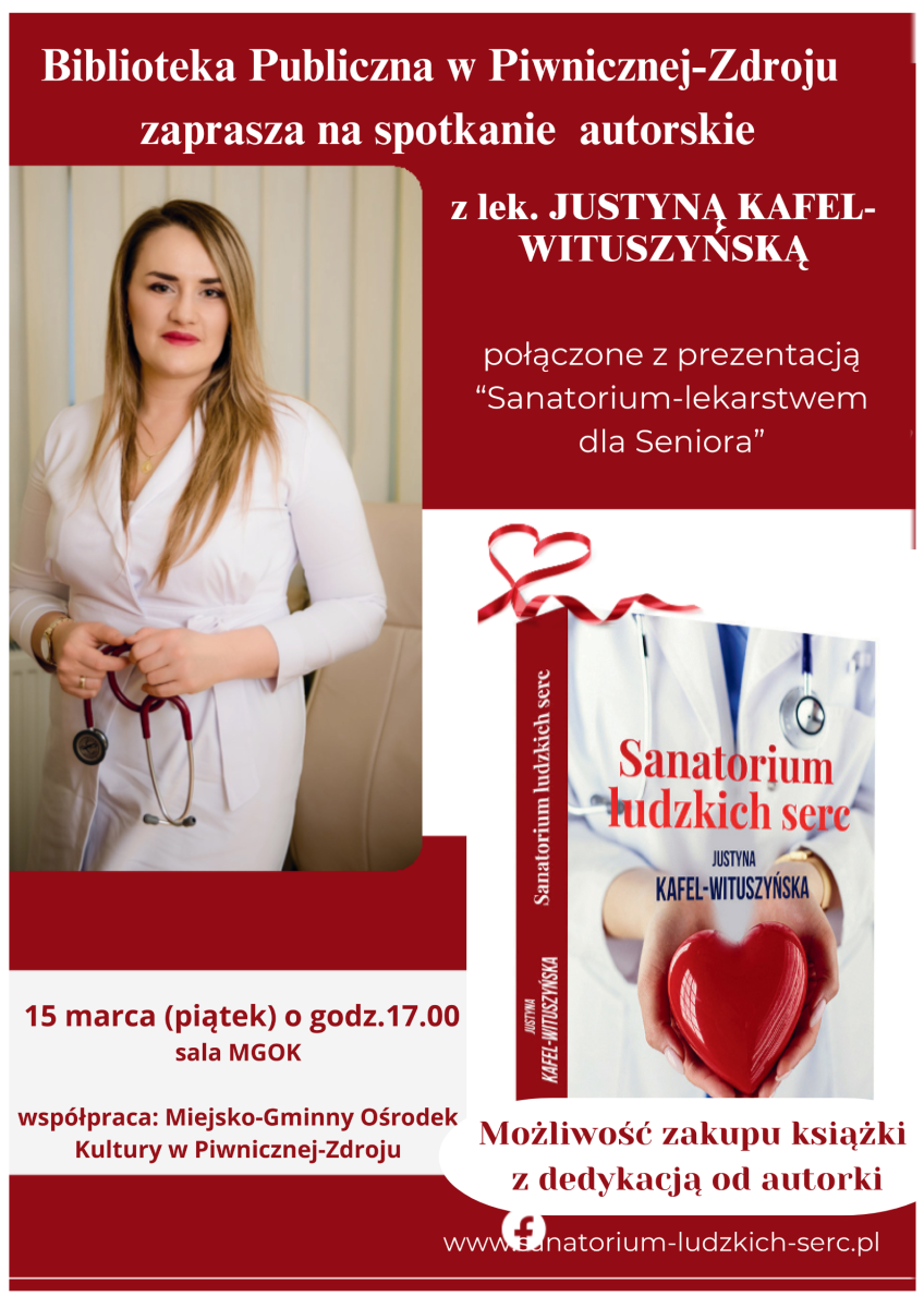 Biblioteka: Zaproszenie na spotkanie autorskie godz. 17.00 z lek. Justyną Kafel-Wituszyńską