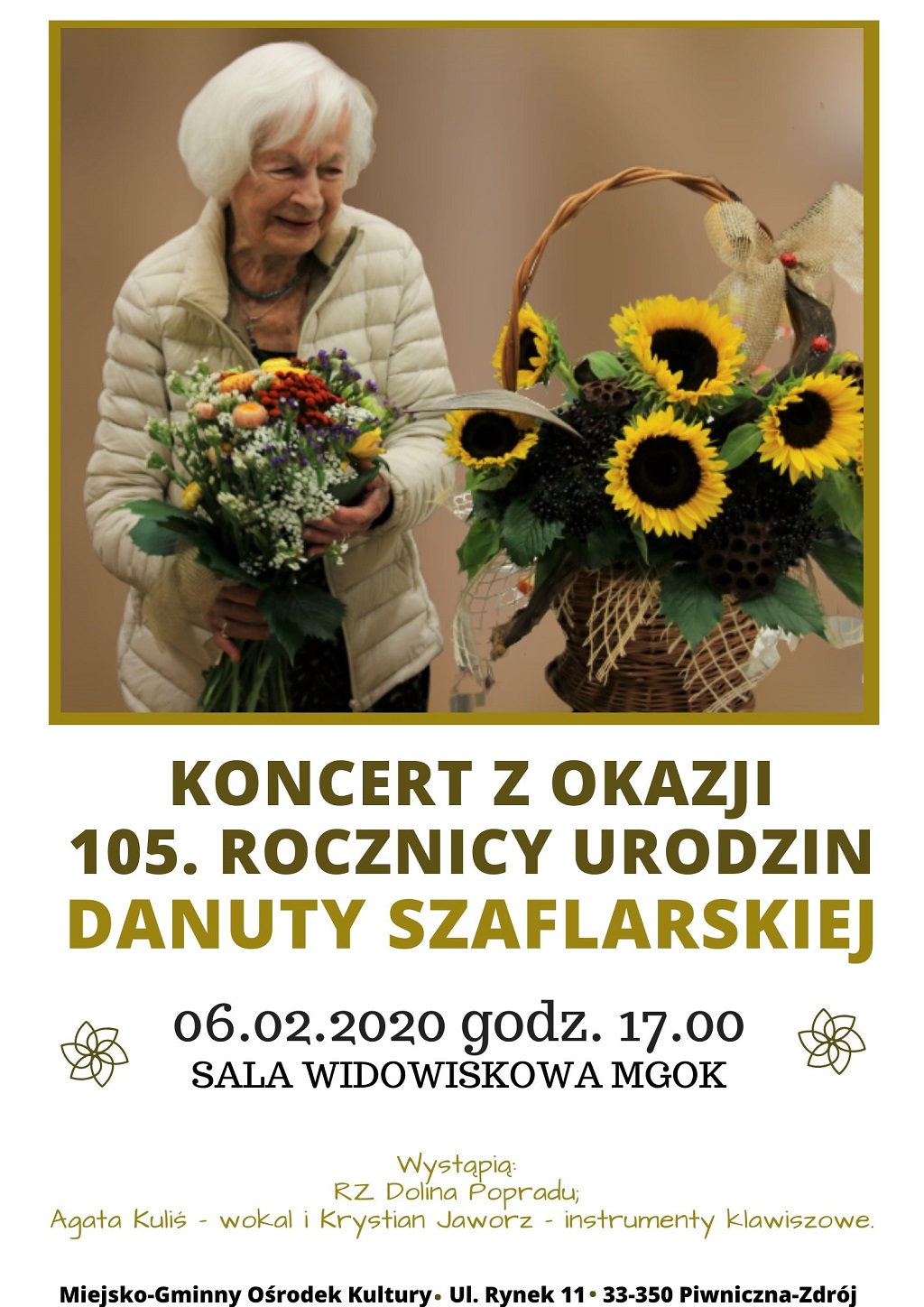 Szanowni Państwo, mamy zaszczyt zaprosić na koncert z okazji 105. rocznicy urodzin Danuty Szaflarskiej, który odbędzie się dnia 6 lutego 2020 roku (czwartek) o godz. 17:00 w sali widowiskowej Miejsko-Gminnego Ośrodka Kultury w Piwnicznej-Zdroju, ul. Rynek 11, Piwniczna-Zdrój.