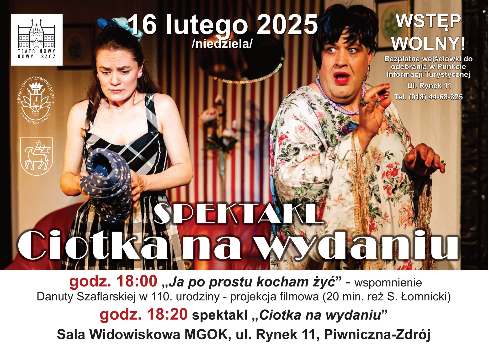 Już 16 lutego zapraszamy na Spektakl "Ciotka na wydaniu" w wykonaniu TEATR NOWY NOWY SĄCZ, a tuż przed na wspomnienie o Danucie Szaflarskiej "Ja po prostu kocham żyć" w reż. Seweryna Łomnickiego (20 min). Bezpłatne wejściówki do odebrania w Informacji Turystycznej (ul. Rynek 11) lub rezerwacja telefoniczna wejściówek: 18/44-68-325. Do zobaczenia