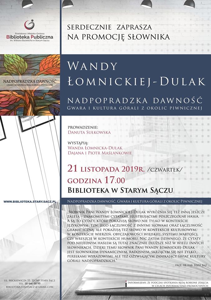 Powiatowa i Miejsko-Gminna Biblioteka Publiczna w Starym Sączu serdecznie zaprasza na promocję słownika Wandy Łomnickiej-Dulak pt.” Nadpopradzka Dawność Gwara I Kultura Górali Z Okolicy Piwnicznej”. Promocja odbędzie się 21 listopada 2019 r. (czwartek) o godz. 17:00 – Biblioteka w Starym Sączu.