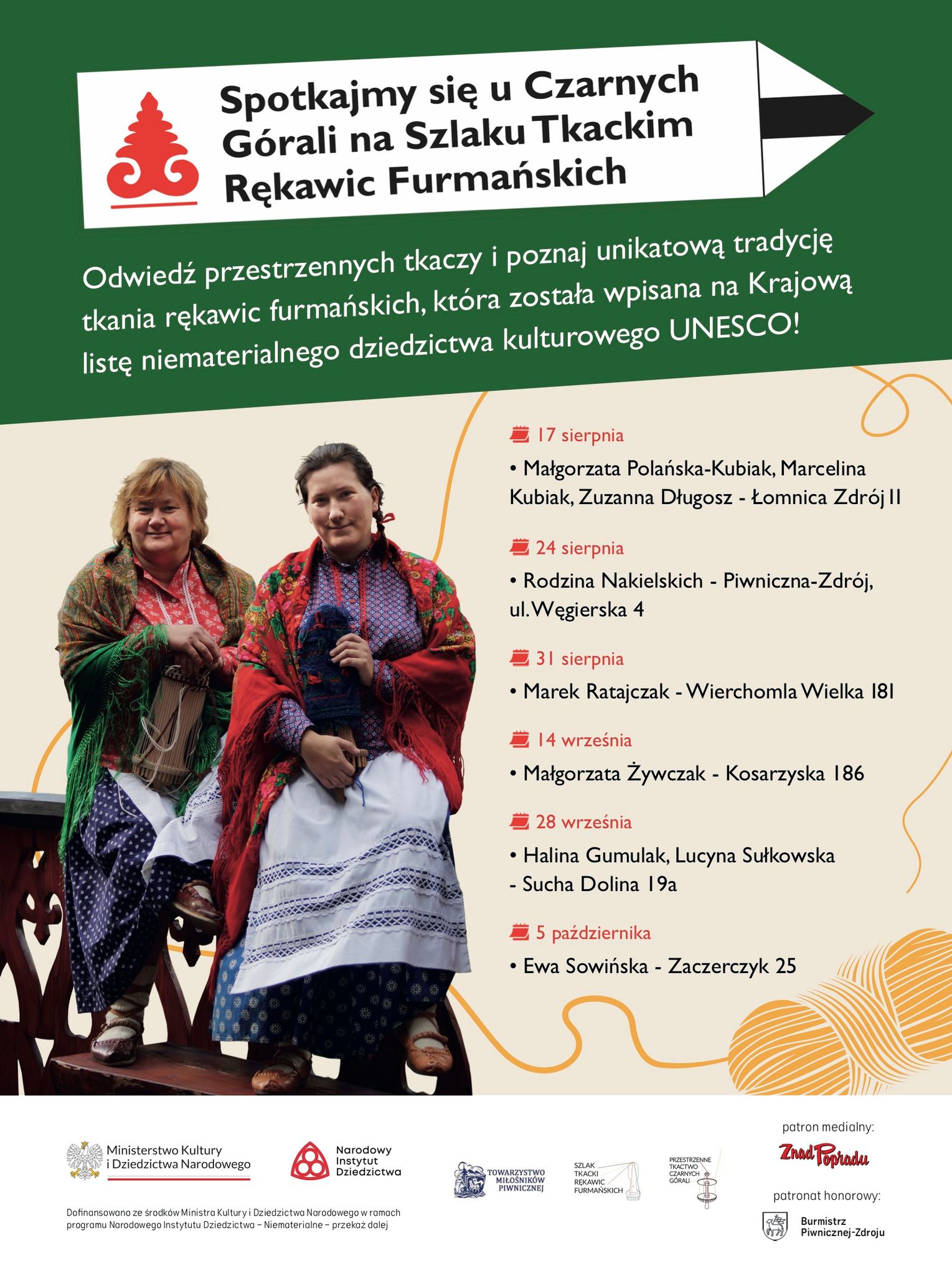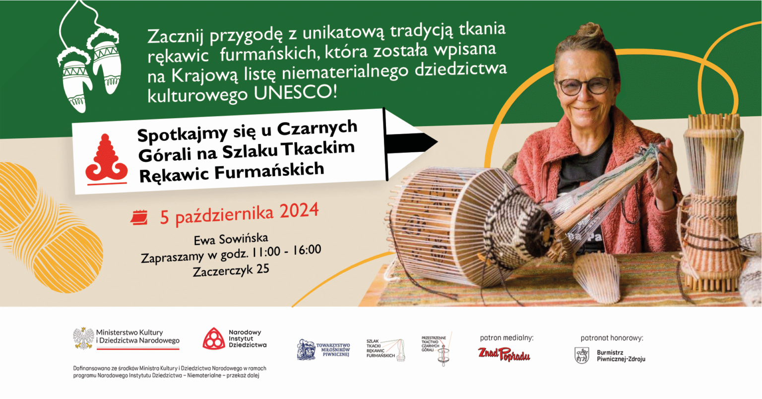 Zaczynamy przygodę z realizacją projektu "Spotkajmy się u Czarnych Górali na Szlaku Tkackim Rękawic Furmańskich", dofinansowanego ze środków Ministra Kultury i Dziedzictwa Narodowego w ramach programu Narodowego Instytutu Dziedzictwa - Niematerialne – przekaż dalej. Już w najbliższą sobotę 17 sierpnia zapraszamy do pracowni Małgorzaty Polańskiej-Kubiak i Marceliny Kubiak w Łomnicy Zdroju. Przyjmujemy także zgłoszenia na 46-godz. wakacyjne warsztaty tkackie w Muzeum Regionalnym, które zaczynamy za tydzień 19 sierpnia. (tel. 663 937 929, muzeumtmp@gmail.com)