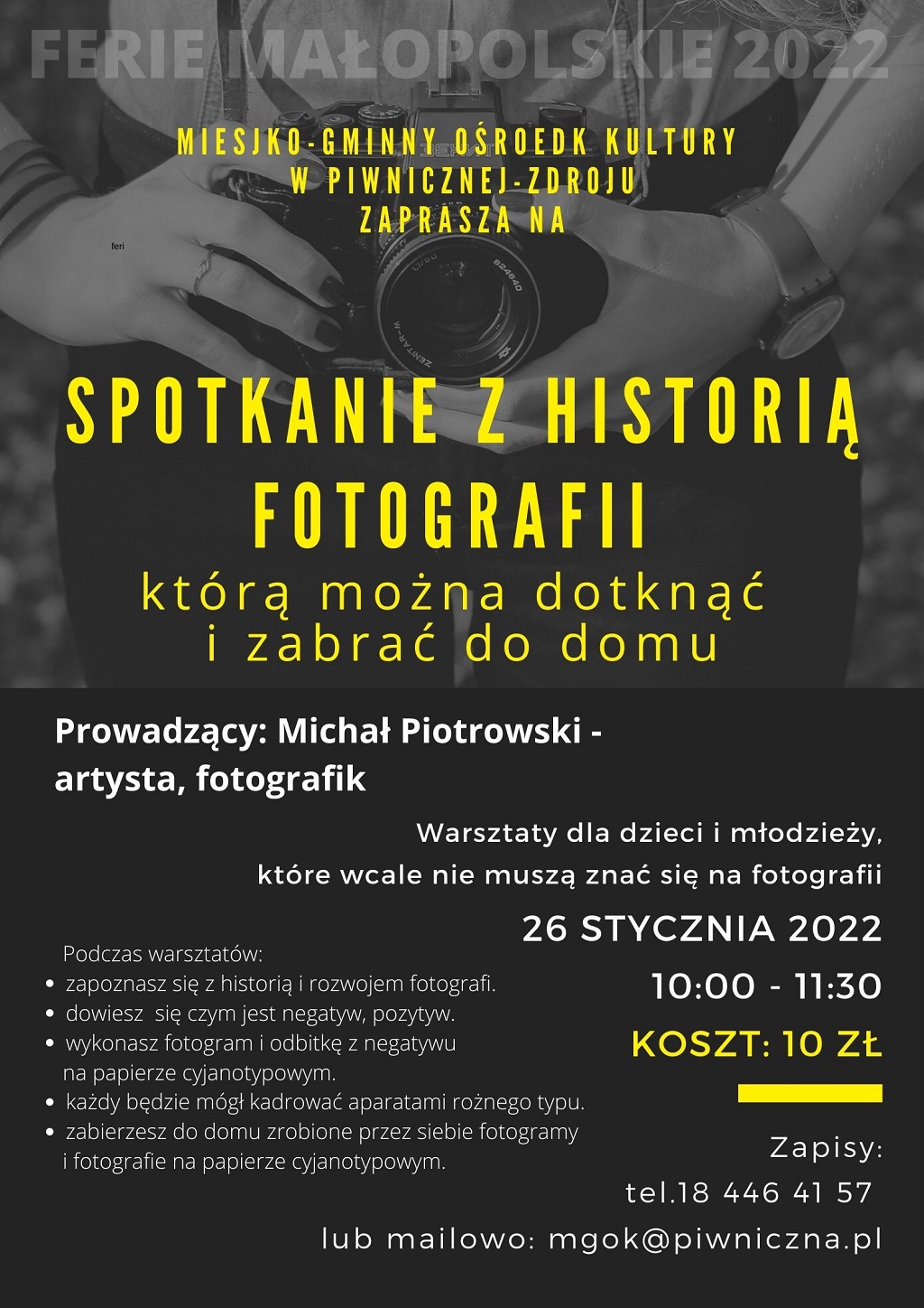 Warsztaty skierowane są do osób od lat 5 do 17 lat, które wcale nie muszą znać się na fotografii. Prowadzącym będzie Michał Piotrowski artysta fotografik, nauczyciel z wieloletnim stażem, autor kilkudziesięciu wystaw w kraju i za granicą, zdobywca licznych nagród w konkursach fotograficznych. Za swoją pracę otrzymał wiele odznaczeń, w tym „Zasłużony dla kultury Polskiej”, „Za zasługi dla fotografii”, „Brązowy medal -Za fotograficzną Twórczość”. Uczy fotografii, powadzi wykłady i prelekcje o tematyce związanej z fotografią i sztuką. Propaguje stare techniki fotograficzne: fotografia otworkowa, guma chromianowa, gumoolej, cjanotypia (na szkle, drewnie, papierze), mokry kolodiom, papier solny, kaliotypia. Uczestniczy w rekonstrukcjach historycznych jako fotograf z przełomu wieku. Jego prace można oglądać na stronie: fotna.dlm.pl ZAPRASZAMY!