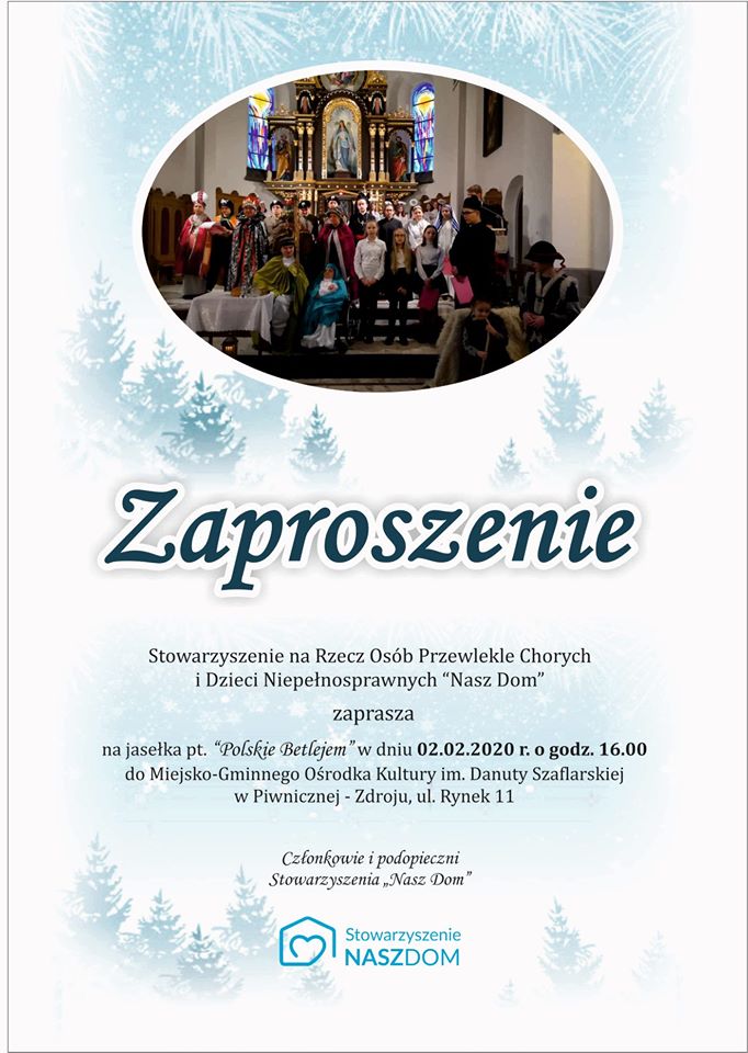 Już w najbliższą niedzielę 2 lutego 2020 roku o godz. 16:00 w Miejsko-Gminny Ośrodku Kultury w Piwnicznej-Zdroju, możecie Państwo obejrzeć i wsłuchać się w patriotyczne jasełka pt. „Polskie Betlejem” w wykonaniu podopiecznych i wolontariuszy Stowarzyszenia Nasz Dom - serdecznie zapraszamy.