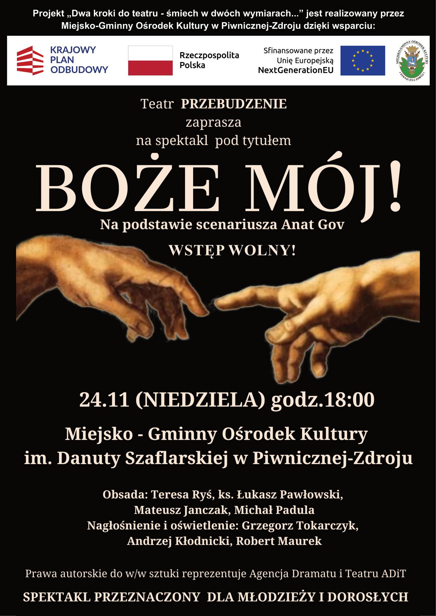 24 listopada 2024 r. (niedziela) o godzinie 18:00 mamy przyjemność zaprosić Państwa na spektakl "Boże mój" w wykonaniu Teatru Przebudzenie" Wstęp wolny! Spektakl realizowany w ramach projektu "Dwa kroki do teatru - śmiech w dwóch wymiarach", a dzięki wsparciu z KPO dla Kultury ze środków pochodzących z Unii Europejskiej NextGenerationEU - wszystkie możecie obejrzeć bezpłatnie.