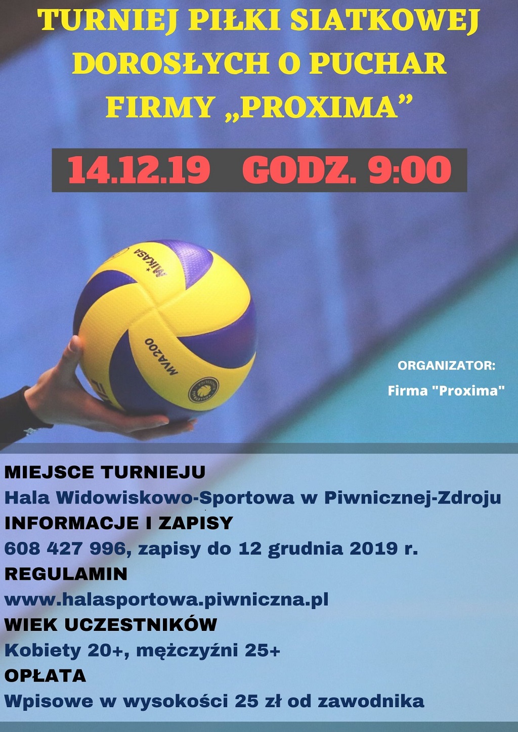 Firma „Proxima” serdecznie zaprasza na turniej piłki siatkowej dorosłych o puchar firmy „Proxima”, który odbędzie się 14 grudnia 2019 roku o godz. 9:00 w Hali Widowiskowo-Sportowej w Piwnicznej-Zdroju.