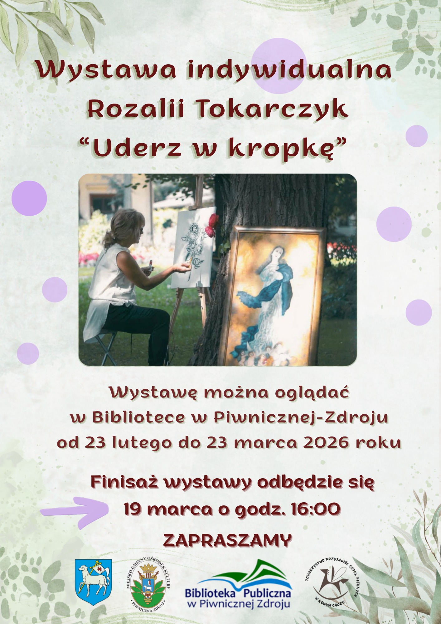 Zapraszamy na wystawę prac Pani Rozalii Tokarczyk /z d. Łomnickiej/ z Piwnicznej, która od 30 lat maluje farbami olejnymi na lnianym płótnie. Artystka wypracowała własną technikę malowania, którą nazywa „uderz w kropkę – hit dot”. Zajmuje się też pisaniem ikon. Od 2019 r. jest członkiem Towarzystwa Przyjaciół Sztuk Pięknych w Nowym Sączu. W tym też roku zdobyła III Nagrodę i Wyróżnienie w kategorii malarstwo olejne i akrylowe w XL Konkursie Plastyki Twórców Towarzystwa Przyjaciół Sztuk Pięknych w Nowym Sączu. Bierze udział w licznych wystawach zbiorowych i plenerach.