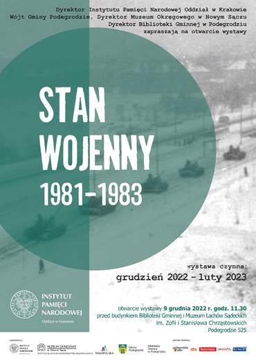 Dyrektor Instytutu Pamięci Narodowej Oddział w Krakowie, Wójt Gminy Podegrodzie, Dyrektor Muzeum Okręgowego w Nowym Sączu, Dyrektor Biblioteki Gminnej w Podegrodziu zapraszają na otwarcie wystawy „Stan wojenny 1981- 1983”.