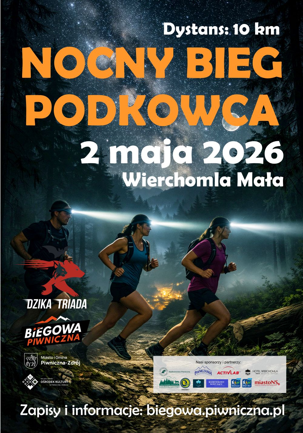 Szczegóły, regulamin oraz link do zapisów na stronie https://biegowa.piwniczna.pl/nocny-bieg-podkowca-2026