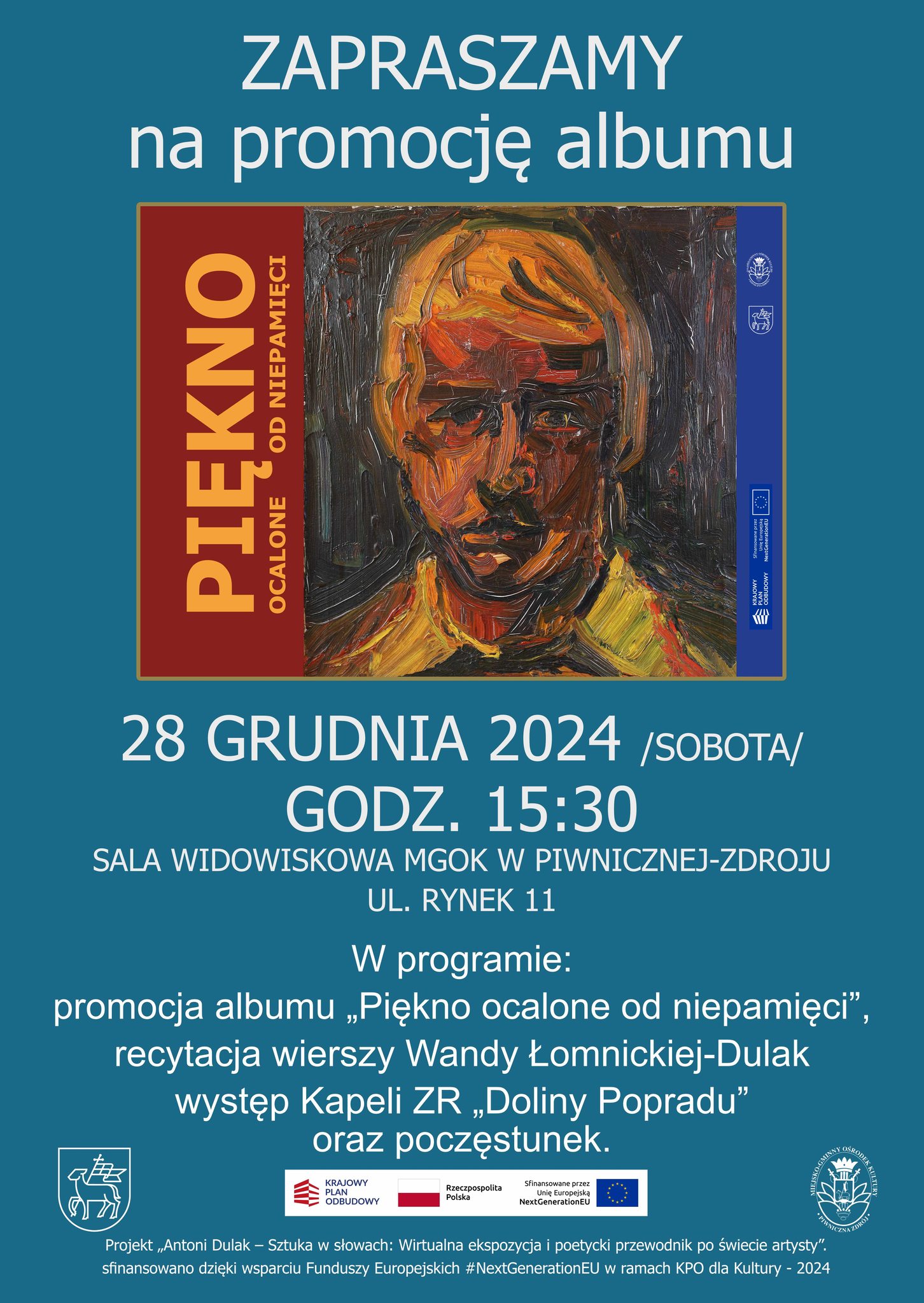 Już 28 grudnia 2024 r. (sobota) o godzinie 15:30 zapraszamy na promocję albumu pt. "Piękno ocalone od niepamięci" zawierającego nieznane prace Antoniego Dulaka, piwniczańskiego artysty. W programie m.in. recytacje wierszy Wandy Łomnickiej-Dulak oraz występ Kapeli z Regionalny Zespół "Dolina Popradu". Serdecznie zapraszamy.