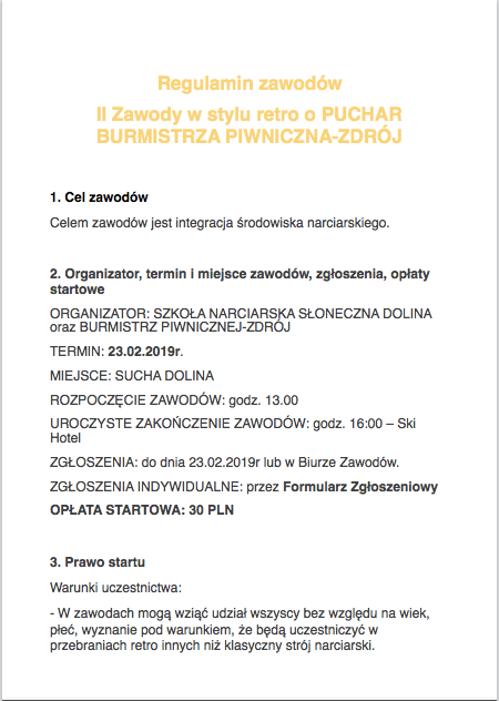 Szkoła Narciarska Słoneczna Dolina serdecznie zaprasza na II zawody w stylu retro o Puchar Burmistrza Piwniczna-Zdrój. Zawody odbędą się 23 lutego 2020 roku o godz. 13:00 Sucha Dolina. Konkurencje: slalom gigant retro i zjazd na „byle czym”. Ponadto za najlepsze przebranie w stylu retro przewidziane są specjalne nagrody! Więcej informacji na FB: @szkolaslonecznadolina