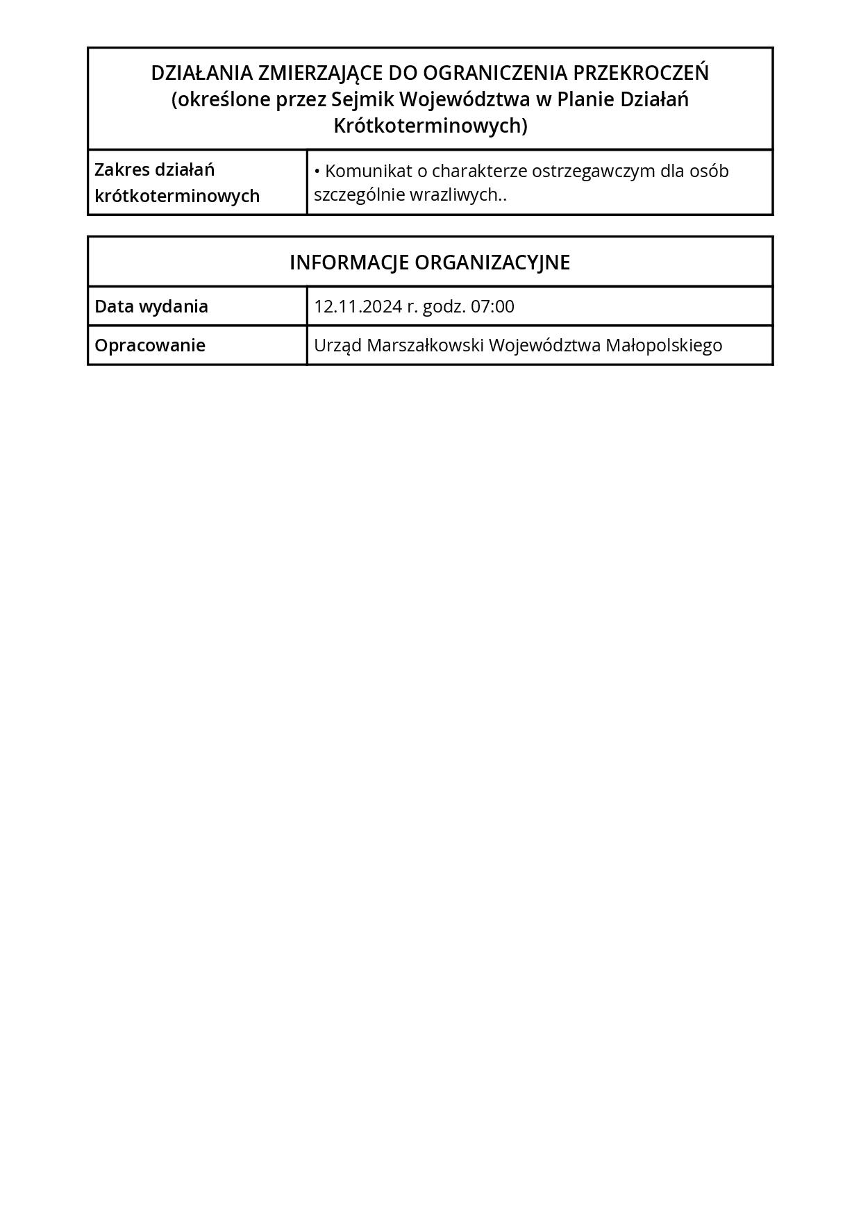 GIOŚ: Powiadomienie o ryzyku wystąpienia przekroczenia średniodobowego poziomu dopuszczalnego dla pyłu zawieszonego PM10 w powietrzu w dniu 12.11.2024 r.