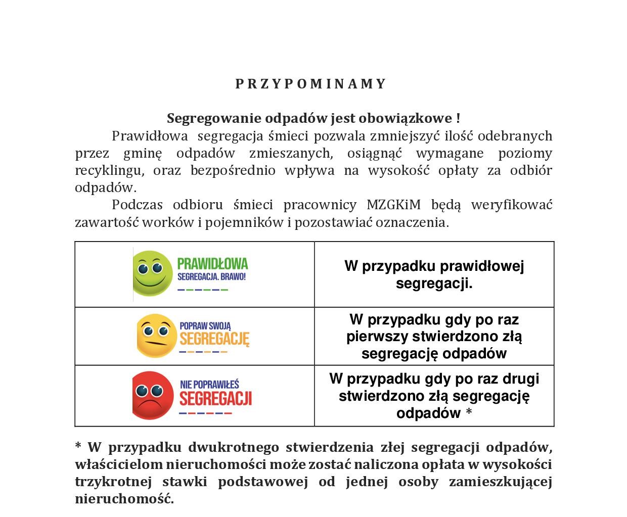 Informujemy, że nowelizacja ustawy o utrzymaniu czystości i porządku w gminach (tj. Dz.U. 2019, poz. 2010) wprowadziła prawny obowiązek segregacji odpadów komunalnych dla wszystkich mieszkańców.