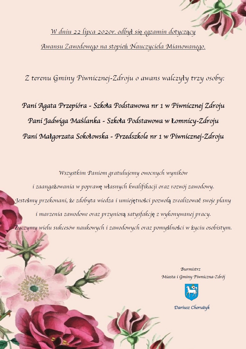 Gratulacje Burmistrza Piwnicznej-Zdroju z okazji awansu zawodowego na stopień Nauczyciela Mianowanego