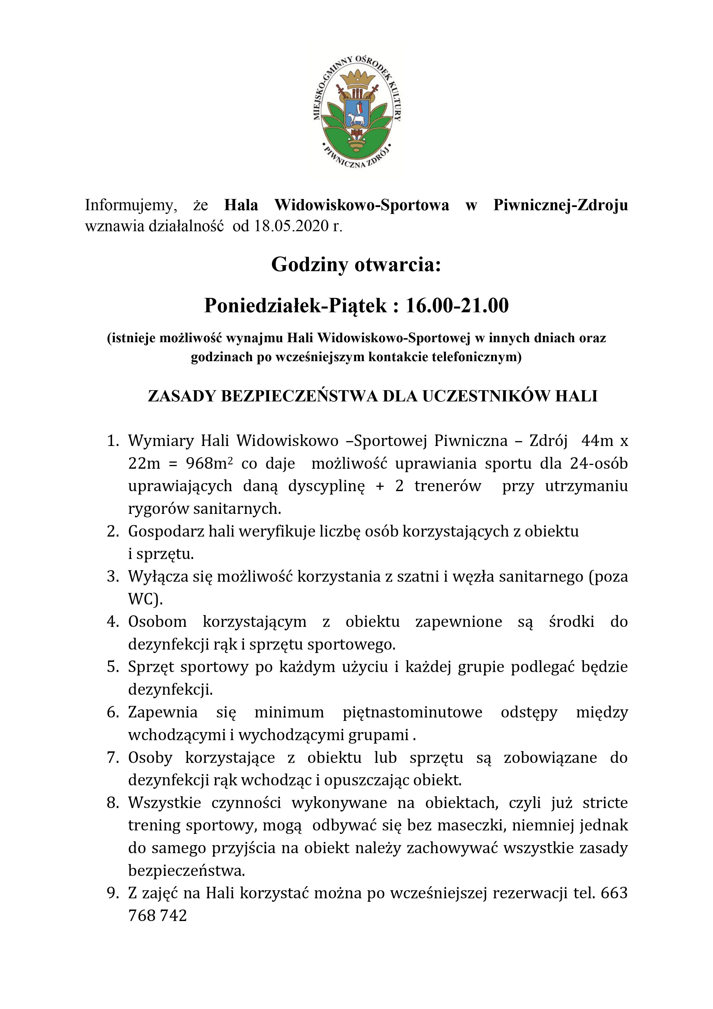 Hala Widowiskowo-Sportowa wznawia działalność !!!