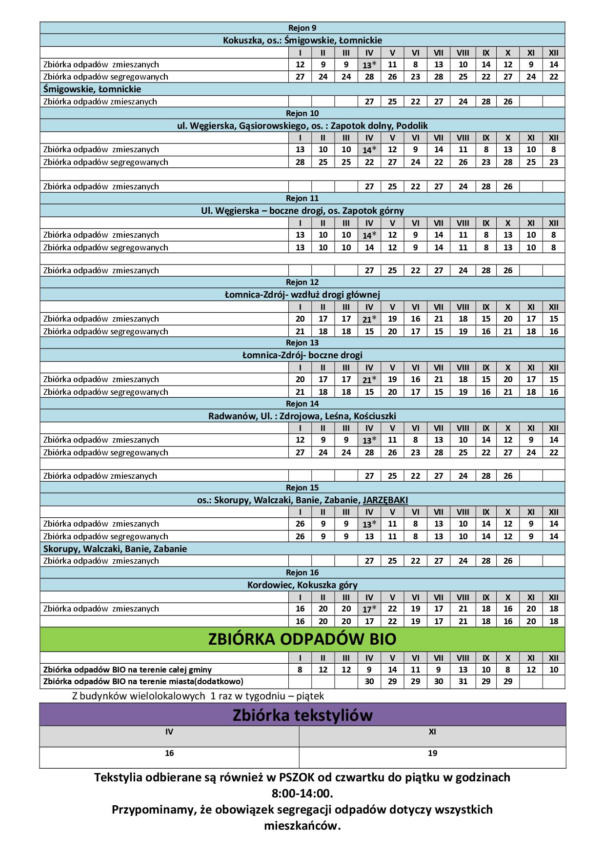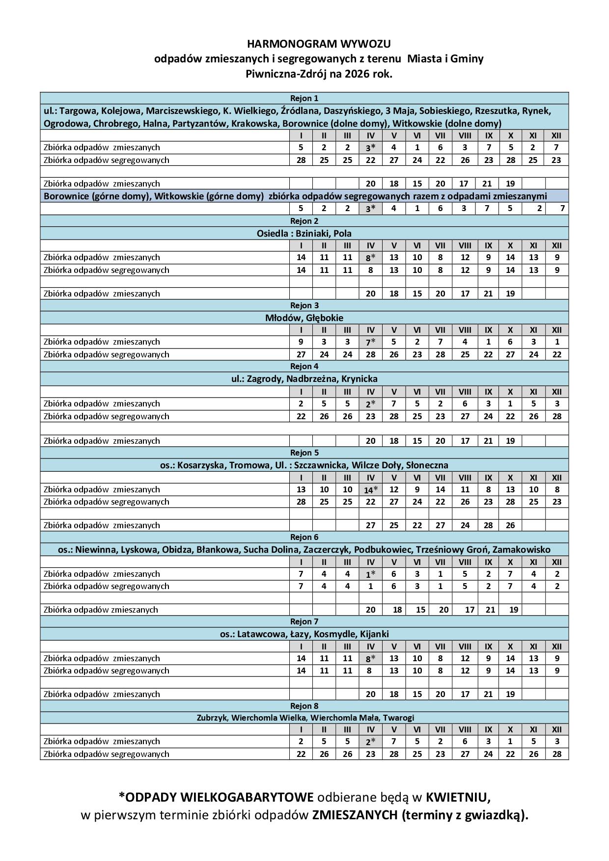 Harmonogram wywozu odpadów na 2022 rok Miasto i Gmina Piwniczna-Zdrój