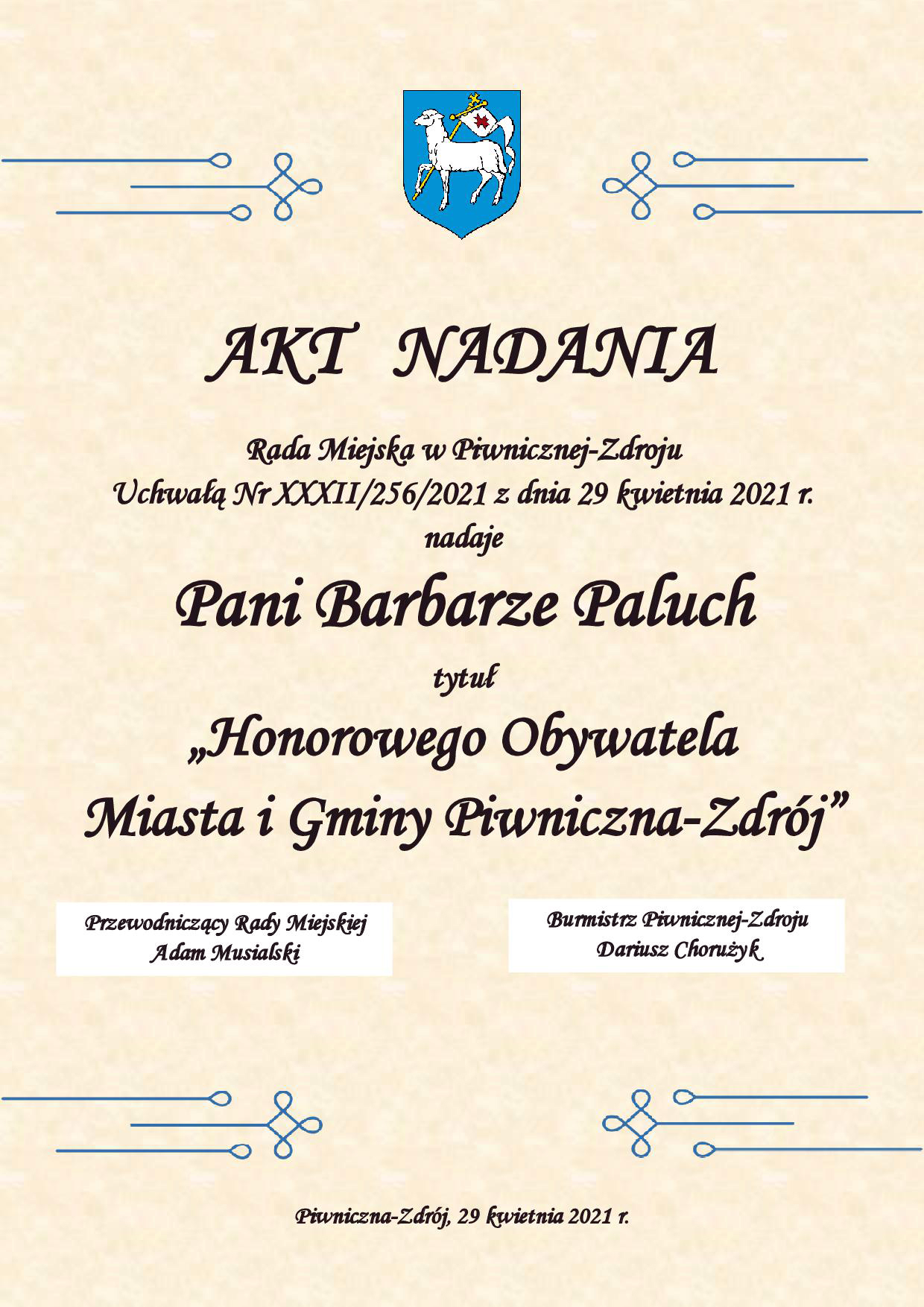 - Barbara Paluch (Paluchowa) z d. Krężołek ur. w Kobylance w Beskidzie Niskim. Art. plastyk - ASP Kraków, poetka - pisze w języku literackim, w gwarze górali nadpopradzkich i pogórzan, animatorka kultury, przez 23 lata do dzisiaj redaktor naczelna miesięcznika lokalnego „Znad Popradu”. Od urodzenia związana z Ziemią Sądecką, szczególnie z uzdrowiskami Krynicą i Piwniczną Zdrojem, gdzie mieszka od 52 lat. Członkini ZPAP, ZLP oddz. Kraków. Jest autorką 15 tomików poezji, w tym jednego dwujęzycznego, dwuczęściowego autorskiego albumu o dziedzictwie kulturowym Miasta i Gminy Piwniczna-Zdrój „Dar Pamięci - dawni ludzie, rodziny, dawne domy” i 3 książeczek dla dzieci, które sama ilustrowała: • Za co babcia kocha Kraków • O kwiatach i Agatce niejadce • O góralce Hanusi i panience Danusi – opowieść o dawnym dzieciństwie w górach i przyjaźni dwóch dziewczynek: Danuty Szaflarskiej i jej o 9 lat starszej piastunki Anny Kluskowej z d. Piekarczyk. Ilustratorka wielu wydawnictw poetyckich, almanachów pokonkursowych. Autorka okładek książek, projektów graficznych i scenografii oraz ponad 30 scenariuszy przedstawień dla najmłodszych. Pomysłodawczyni i organizatorka odbywających się przez 20 lat Międzynarodowych Spotkań Poezji i Muzyki Gór "Wrzosowisko", Międzynarodowego Konkursu Poetyckiego "Sen o Karpatach" i trzech Międzynarodowych plenerów malarskich „Beskid pędzlem zapisany”. Zaprojektowała pomnik Zakładników Rozstrzelanych w Młodowie. W Muzeum Regionalnemu TMP znajdują się jej autorstwa dwa pastelowe portrety mieszkanek gminy: Anny z Łomnicy Zdroju i Katarzyny z Łazów. Jest laureatką głównych nagród w wielu prestiżowych polskich konkursach poetyckich. Odznaczona nagrodą Województwa Małopolskiego im. Romana Reinfussa, nagrodą im Władysława Orkana, Złotym Jabłkiem Sądeckim, nagrodą Ministerstwa Kultury i Dziedzictwa Narodowego Gloria Artis – Zasłużony dla Kultury Polskiej, nagrodą im. księdza prof. Bolesława Kumora „Sądecki Autor” przyznanym przez dzieci Orderem Uśmiechu oraz wieloma innymi. TVP pr 2 w r. 2014 nagrała o niej w cyklu ”AKTYWNI 60+” film „Wrzosowa Pani znad Popradu” Czytaj więcej o Barbara Paluch (Paluchowa) z d. Krężołek TU