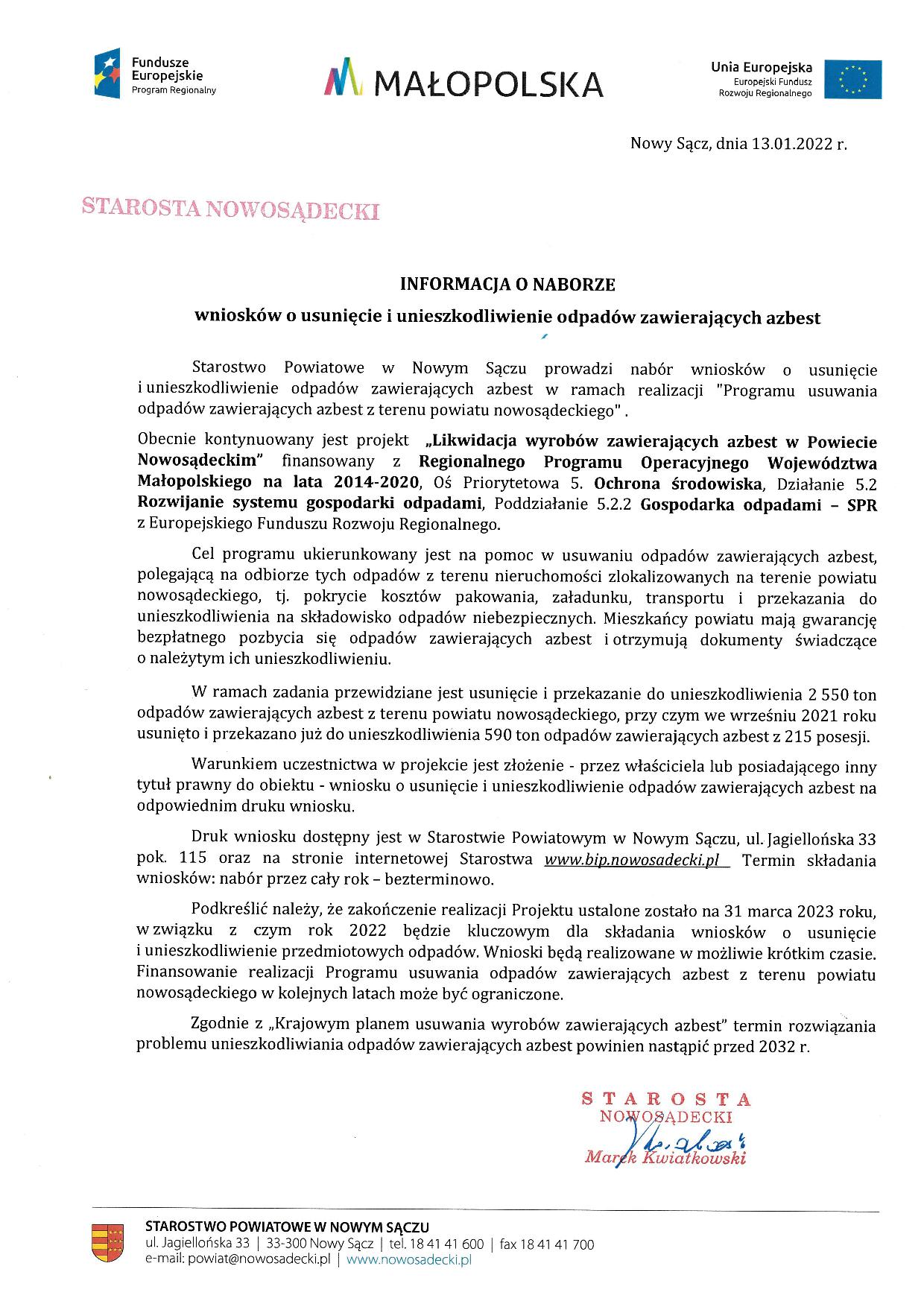 INFORMACJA o naborze wniosków o usunięcie i unieszkodliwienie odpadów zawierających azbest