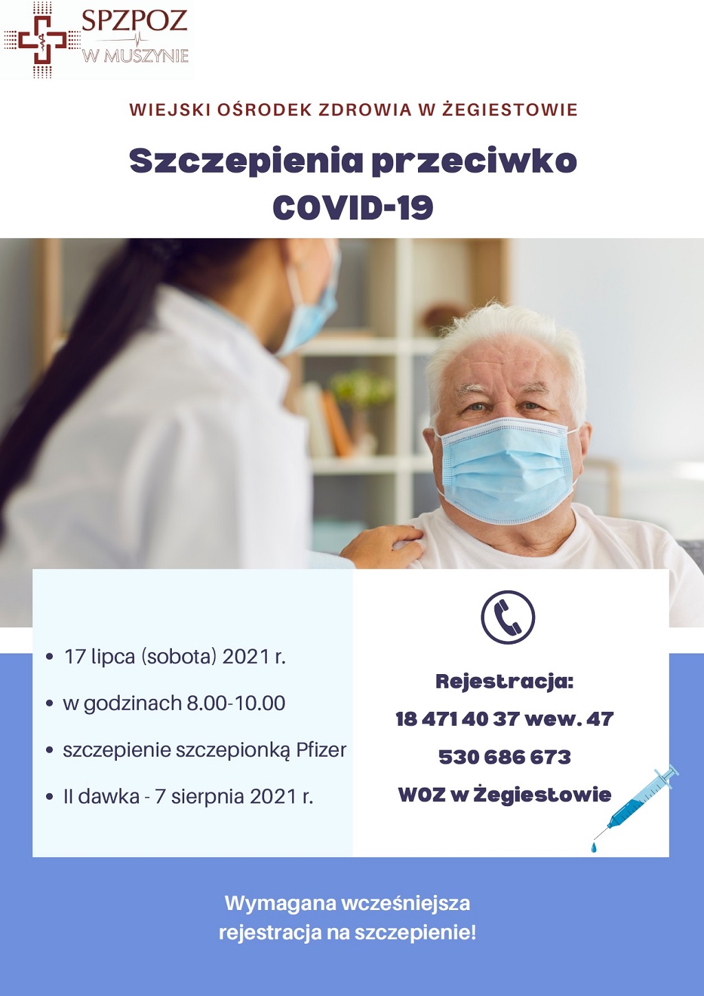 Samodzielny Publiczny Zakład Podstawowej Opieki Zdrowotnej w Muszynie zaprasza na szczepienie przeciwko COVID-19 szczepionką firmy PFIZER do Wiejskiego Ośrodka Zdrowia w Żegiestowie, które odbędzie się w dniu 17 lipca (sobota) br. Zarejestrować się można bezpośrednio w poniedziałek i w środę w godzinach pracy Ośrodka Zdrowia w Żegiestowie lub pod numerami telefonów podanych na plakacie informacyjnym.