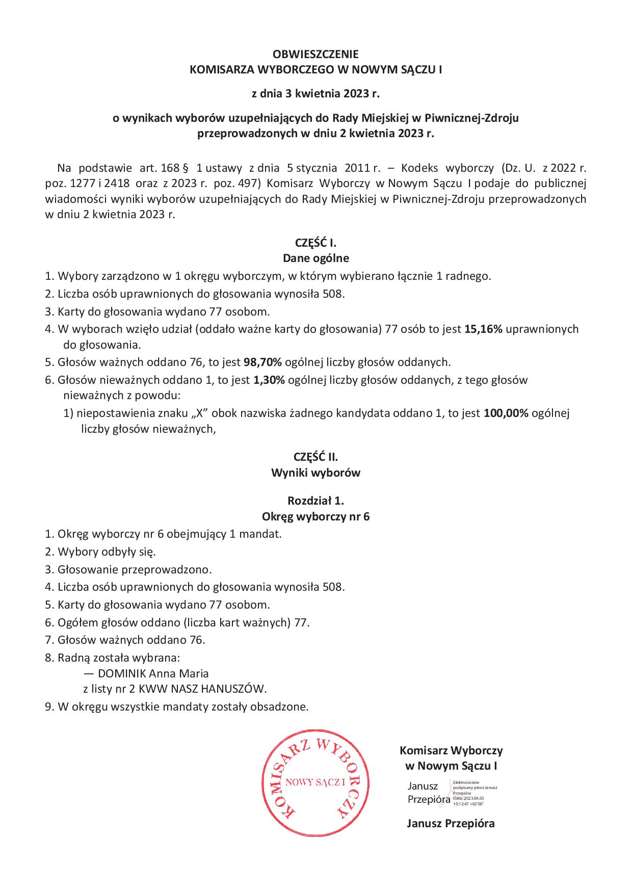 INFORMACJA O WYNIKU WYBORÓW UZUPEŁNIAJĄCYCH